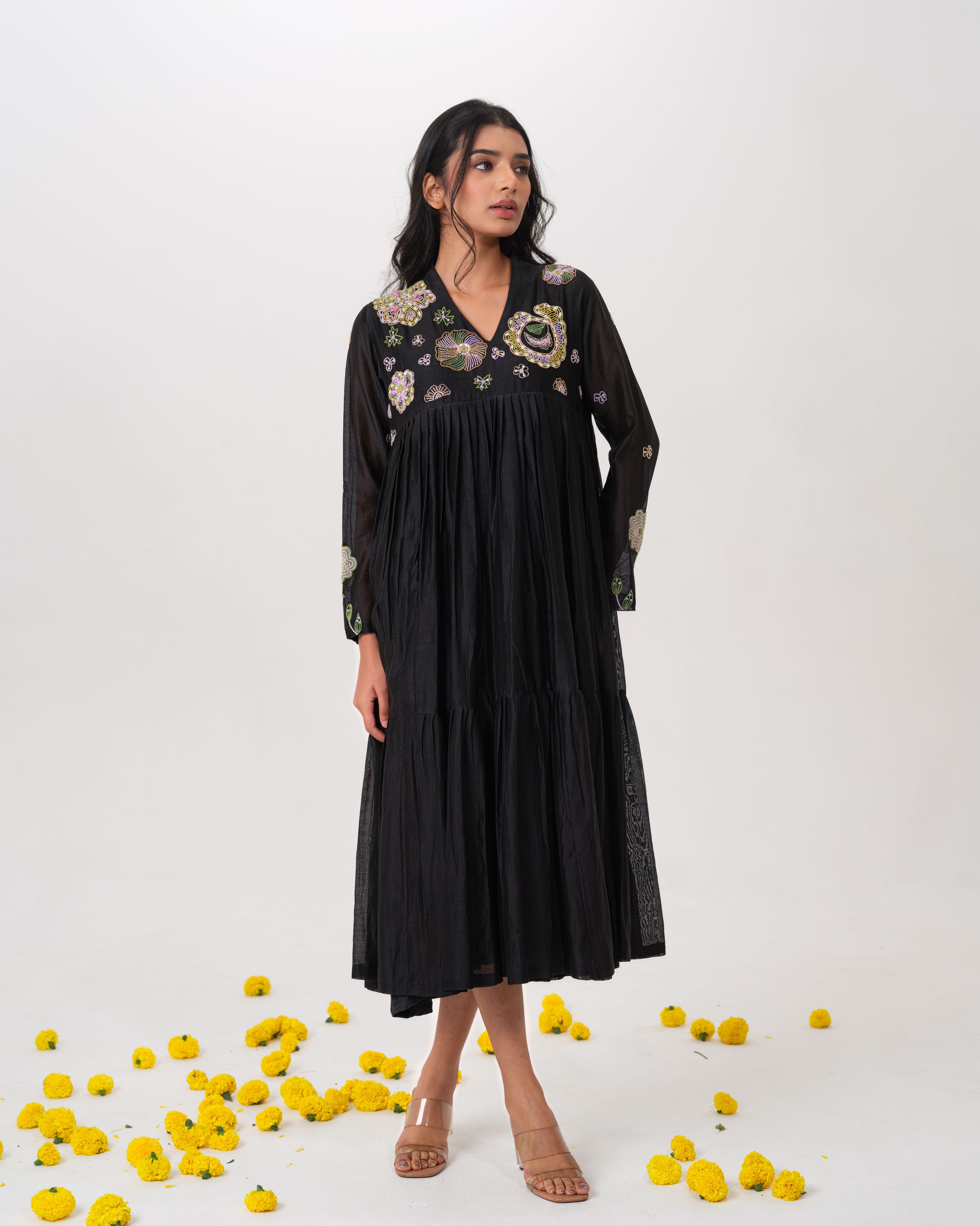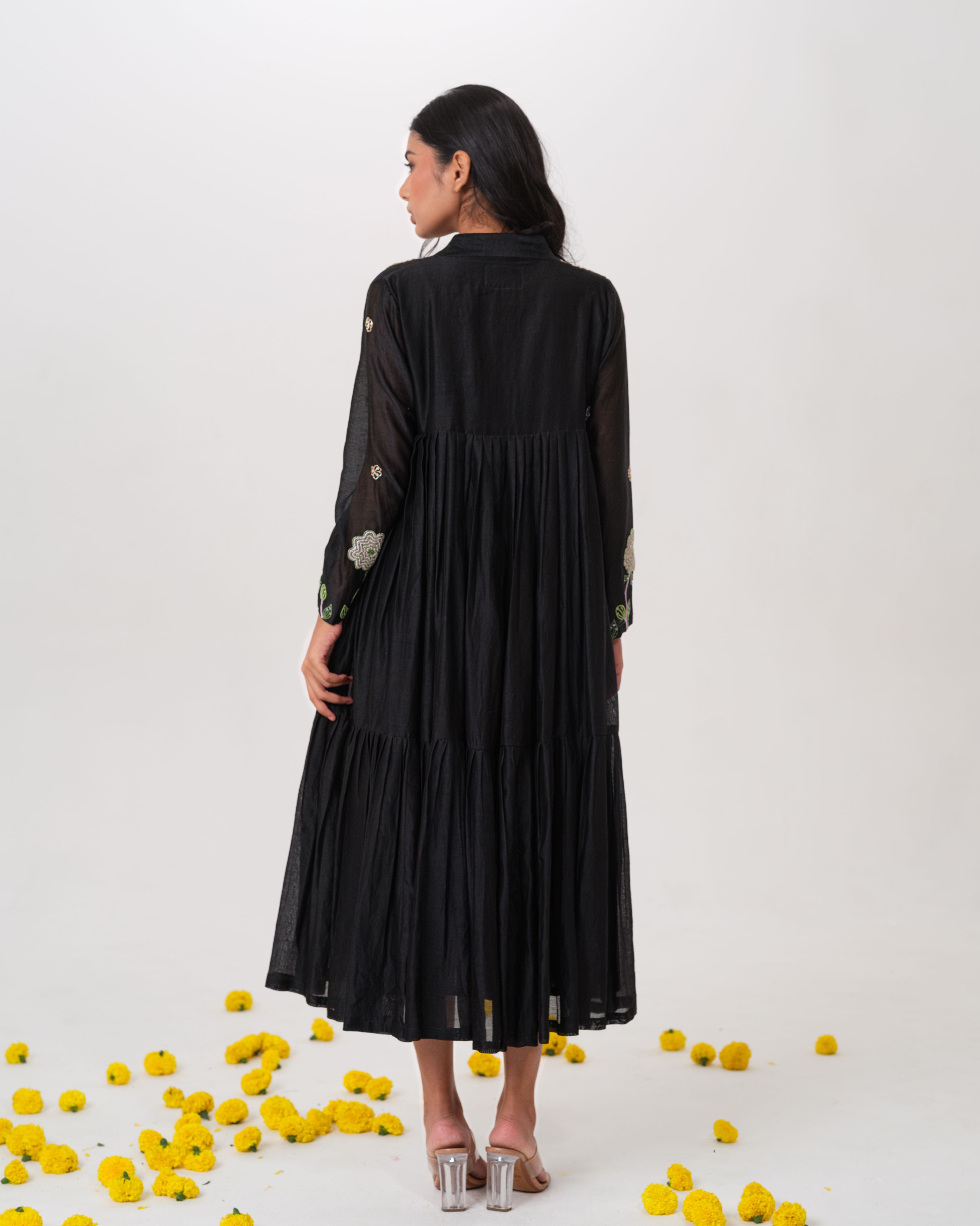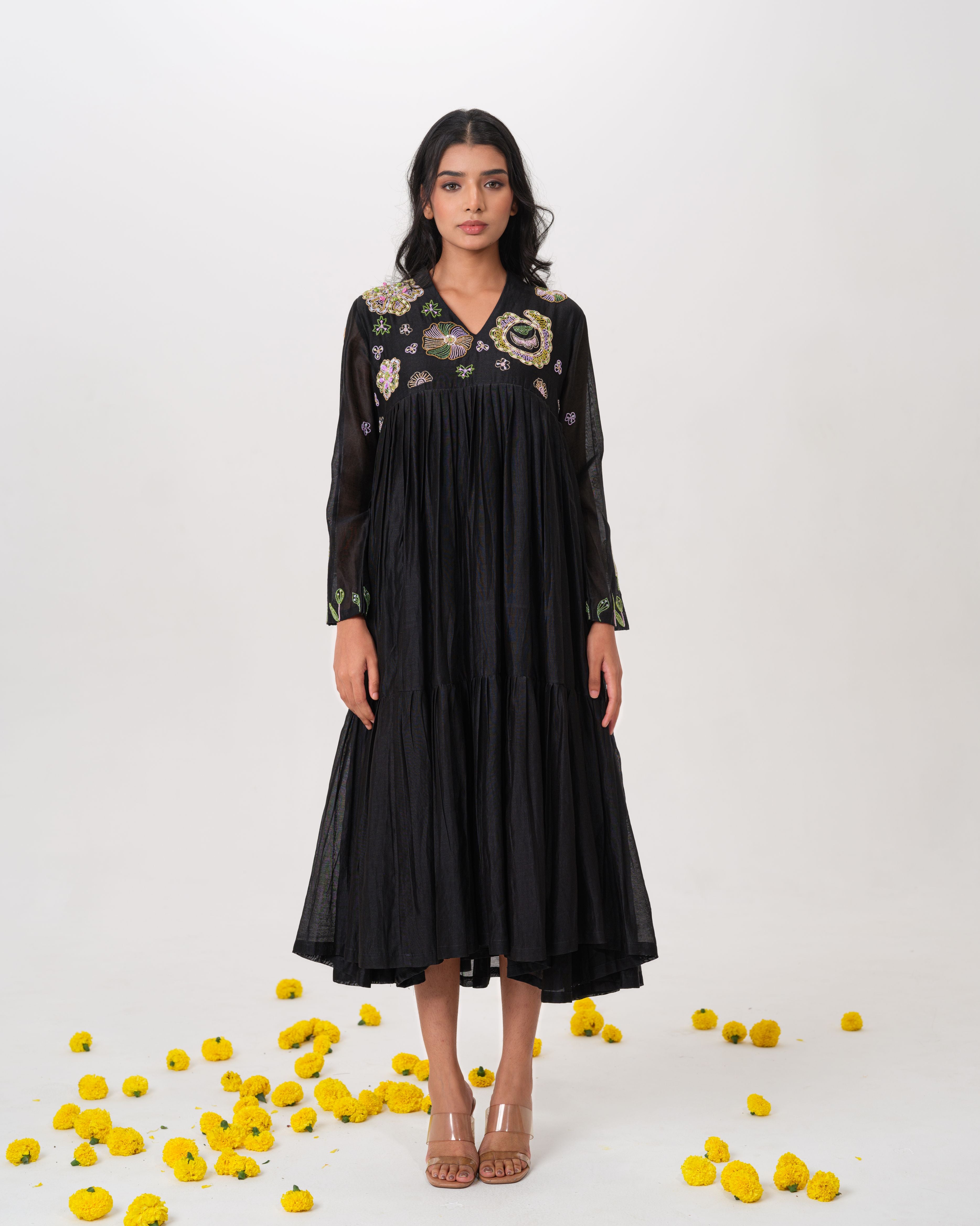 A graceful blend of elegance and artistry, our black chanderi silk layered dress showcases hand embroidered blooming florals in thread and cutdhana. This piece is a quiet expression of luxury with a whisper of sensuality and grace.