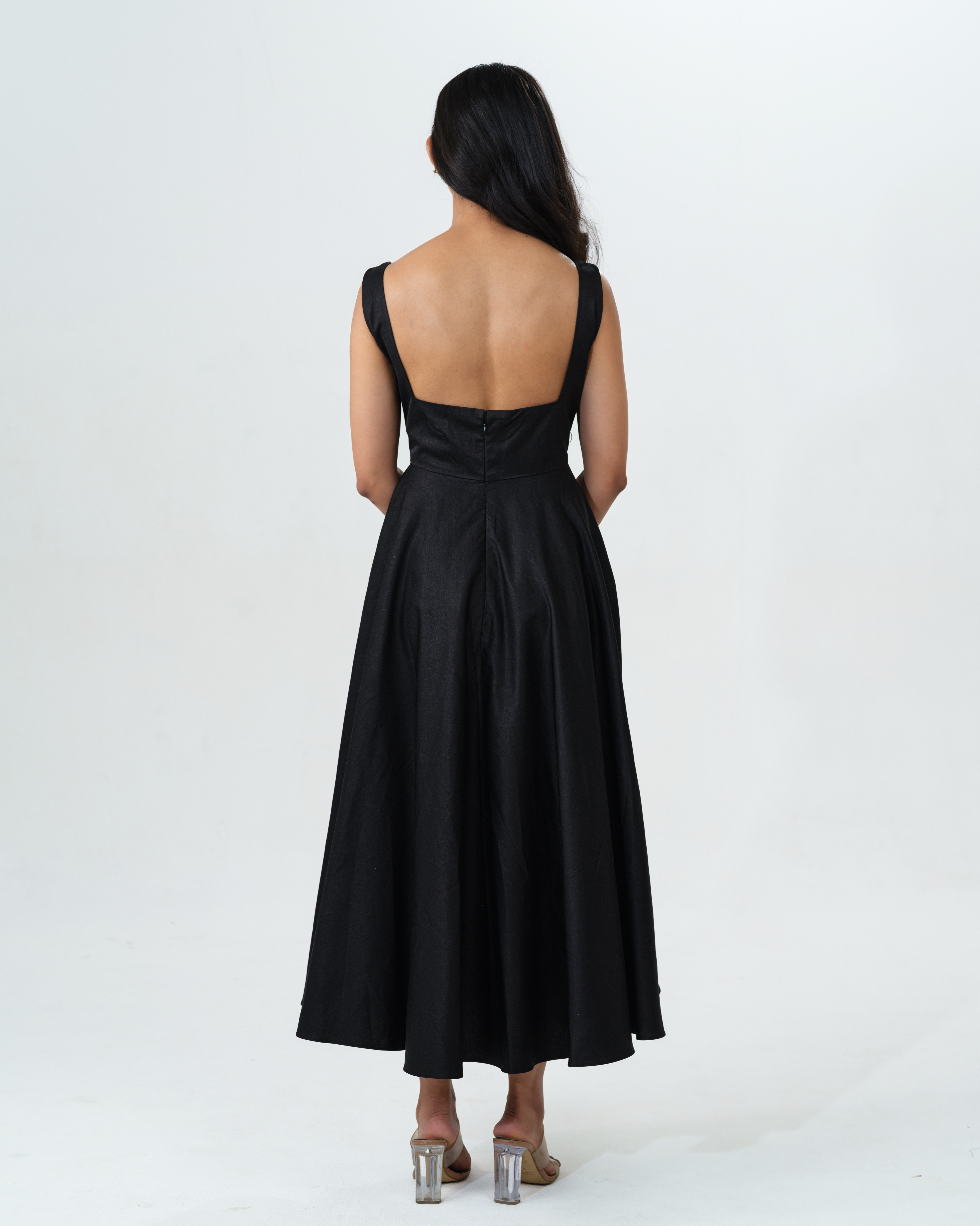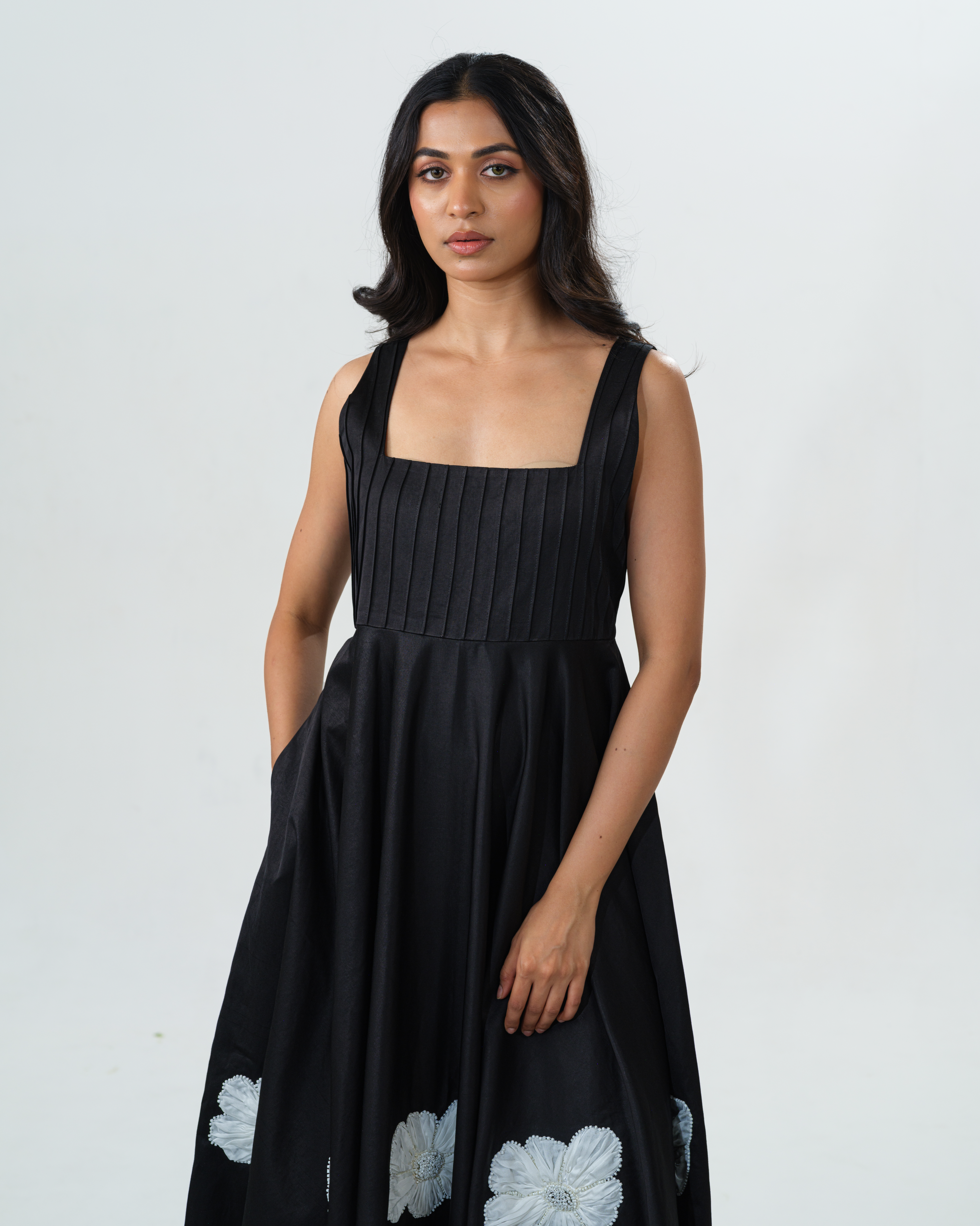 Crafted in rich black cotton satin, this strap dress is defined by its clean square neckline and graceful flared silhouette. Delicate hand-embroidered white applique flowers adorns the lower half of the dress, creating a subtle contrast against the sleek fabric.