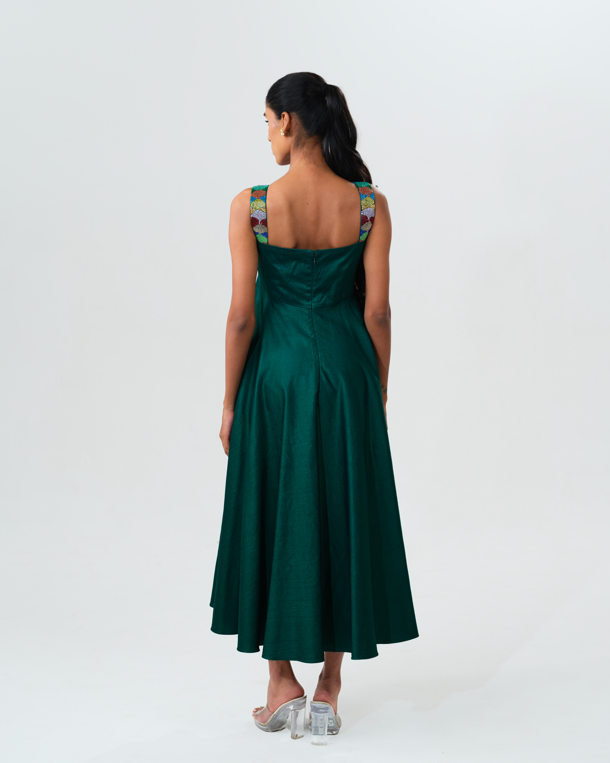 A luminous green cotton satin dress designed with effortless sophistication. This silhouette is elevated by intricate cut dhana hand embroidery on the yoke, adding a subtle shimmer and depth to the outfit. The rich green hue evokes freshness and quiet luxury, making this dress a striking yet graceful statement.