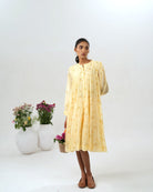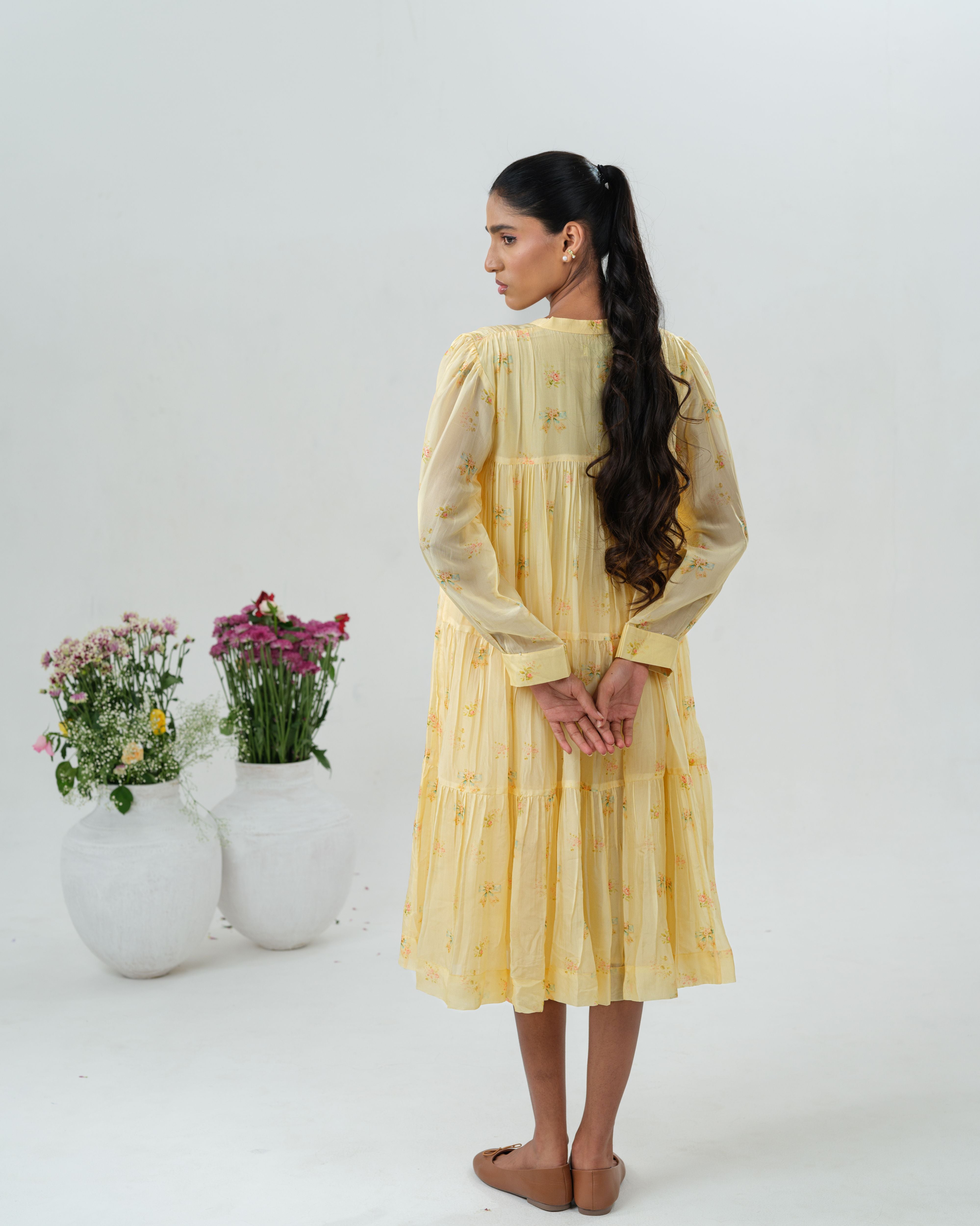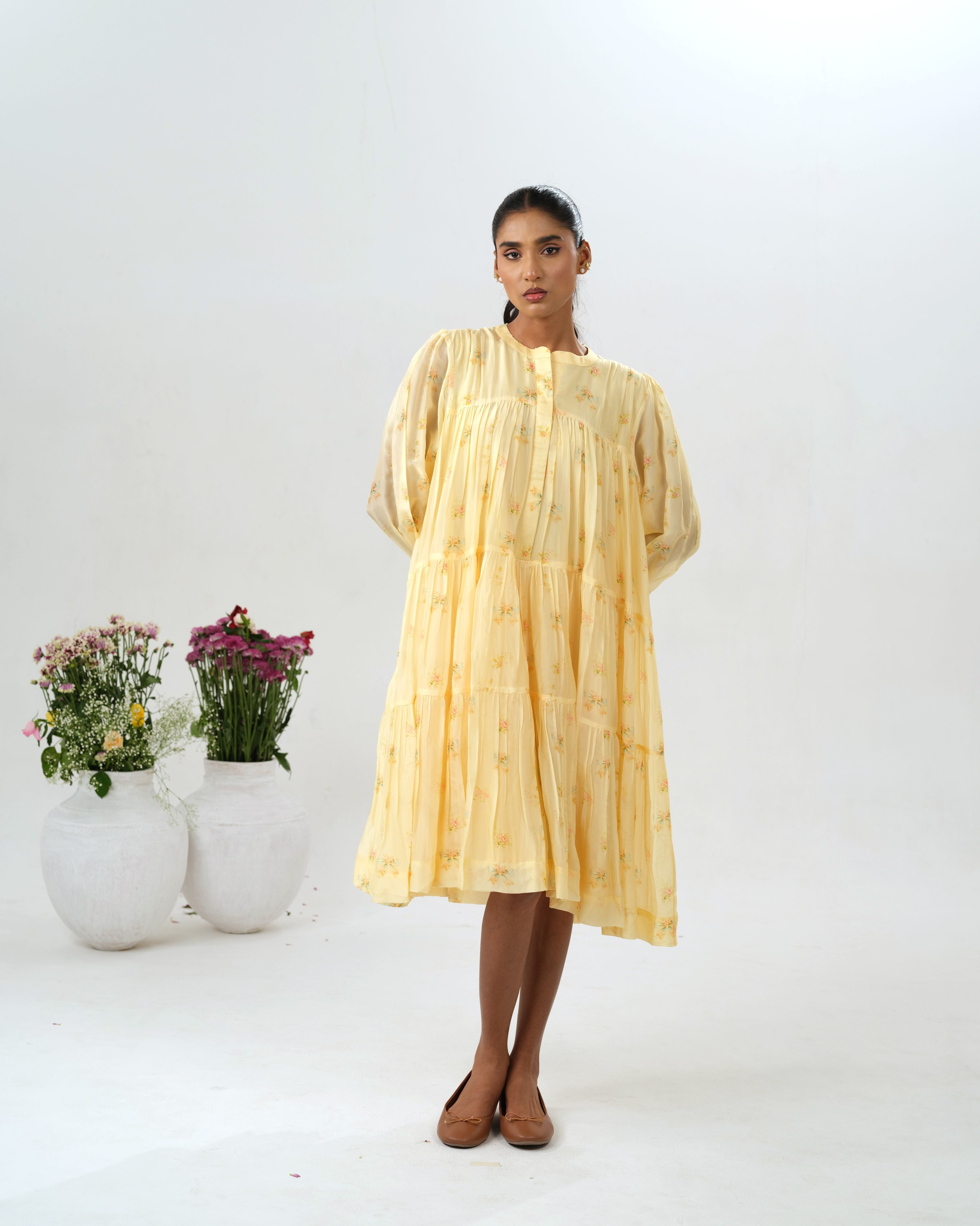 Made in soft Organza, this midi layered dress is a gentle ode to warmth and simplicity. Fine pleats flow down from the yoke, scattered with delicate floral pront that adds a touch of charm.