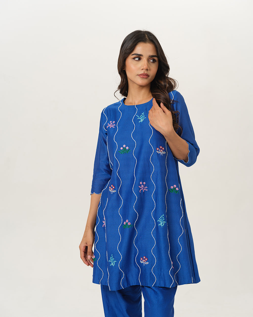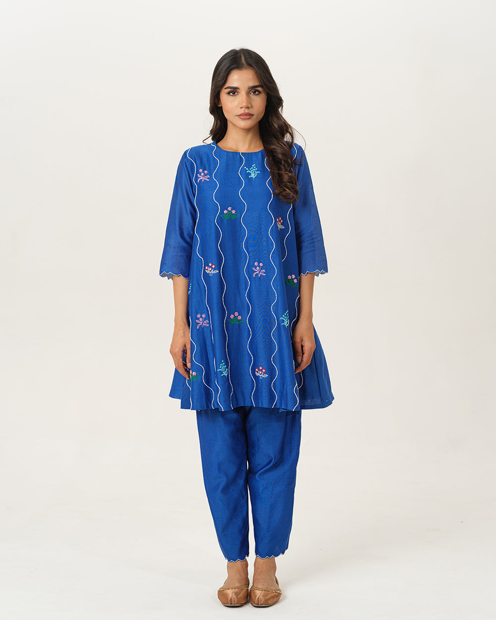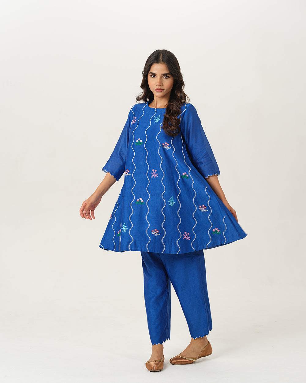 A graceful blend of elegance and artistry, our chanderi silk short A-line coord set showcases hand embroidered  blooming florals in thread, complementing the patterned lines with moti, cutdhana.