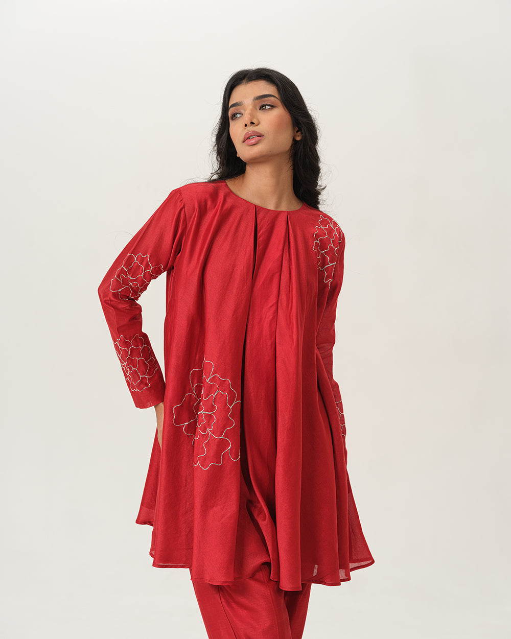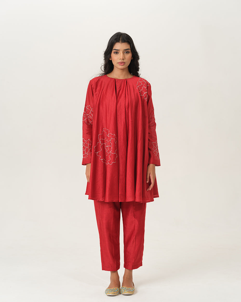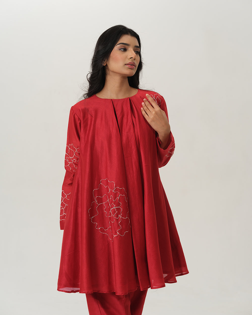 The exquisite chanderi silk coord set, adorned with intricate hand embroidered silver pita work in delicate floral motifs.