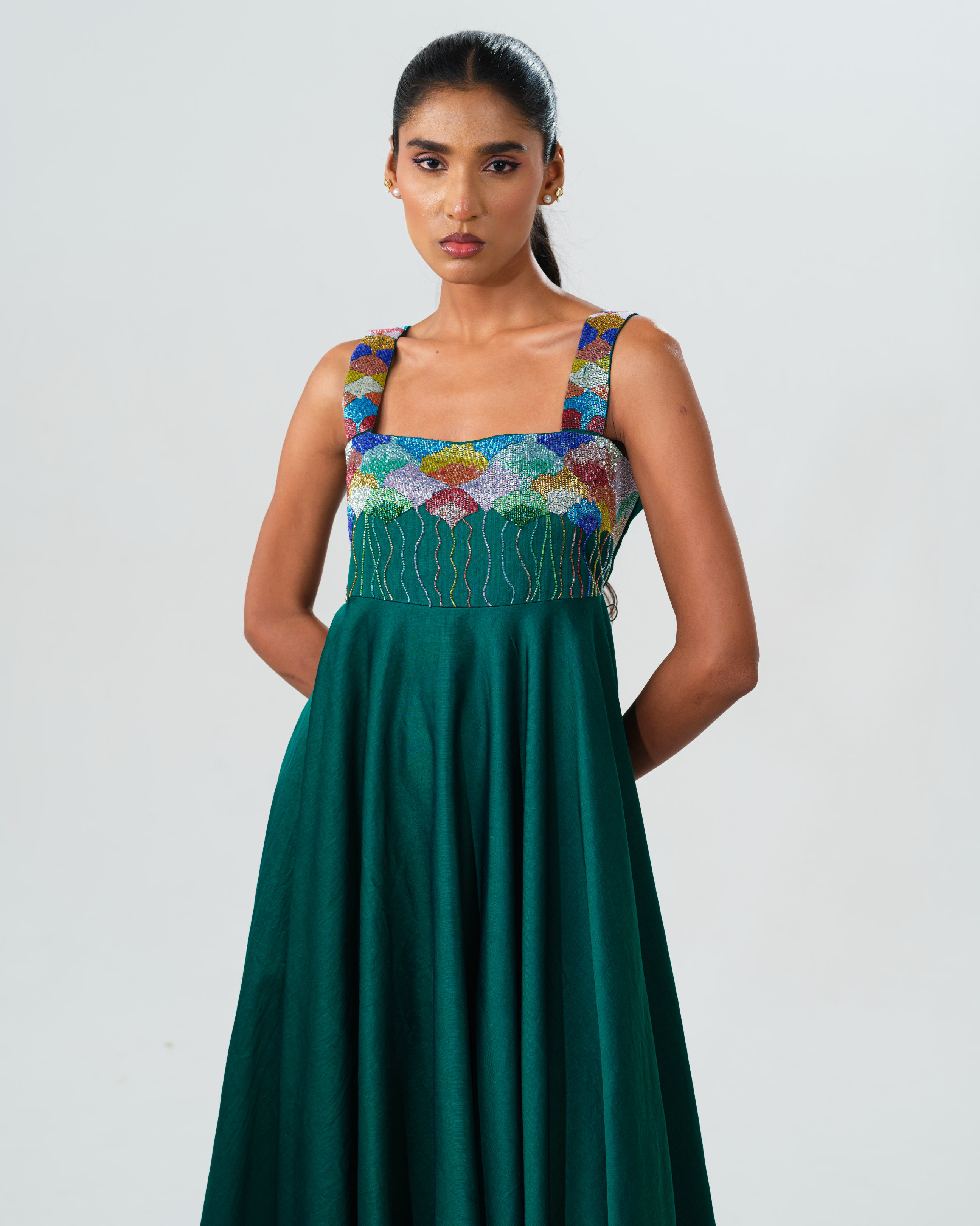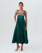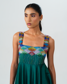 A luminous green cotton satin dress designed with effortless sophistication. This silhouette is elevated by intricate cut dhana hand embroidery on the yoke, adding a subtle shimmer and depth to the outfit. The rich green hue evokes freshness and quiet luxury, making this dress a striking yet graceful statement.