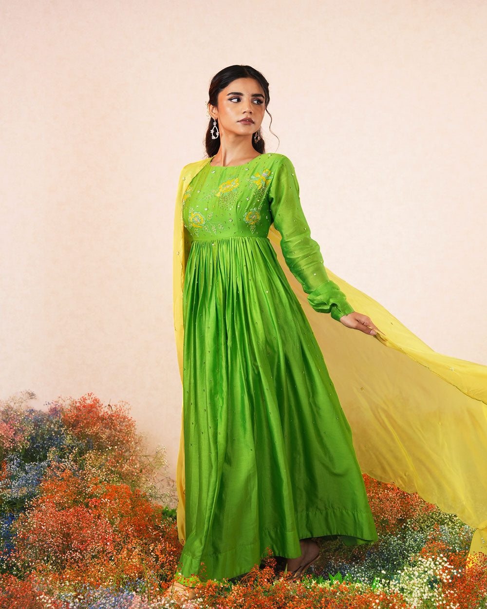 Featuring the lite green chanderi silk intricate hand embroidered Anarkali paired with yellow soft silk dupatta.
