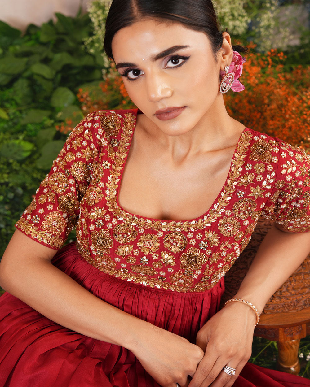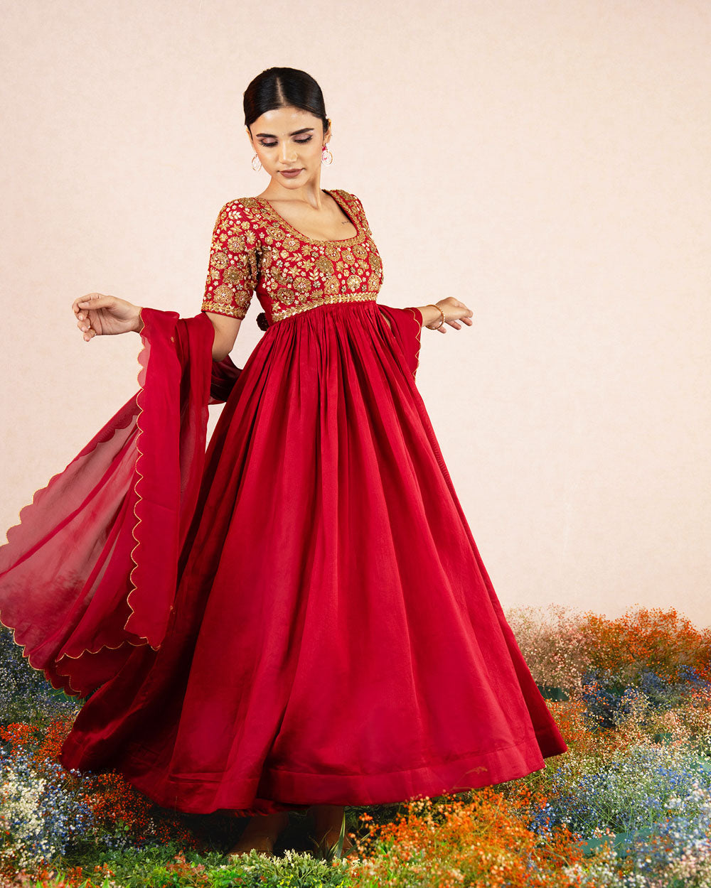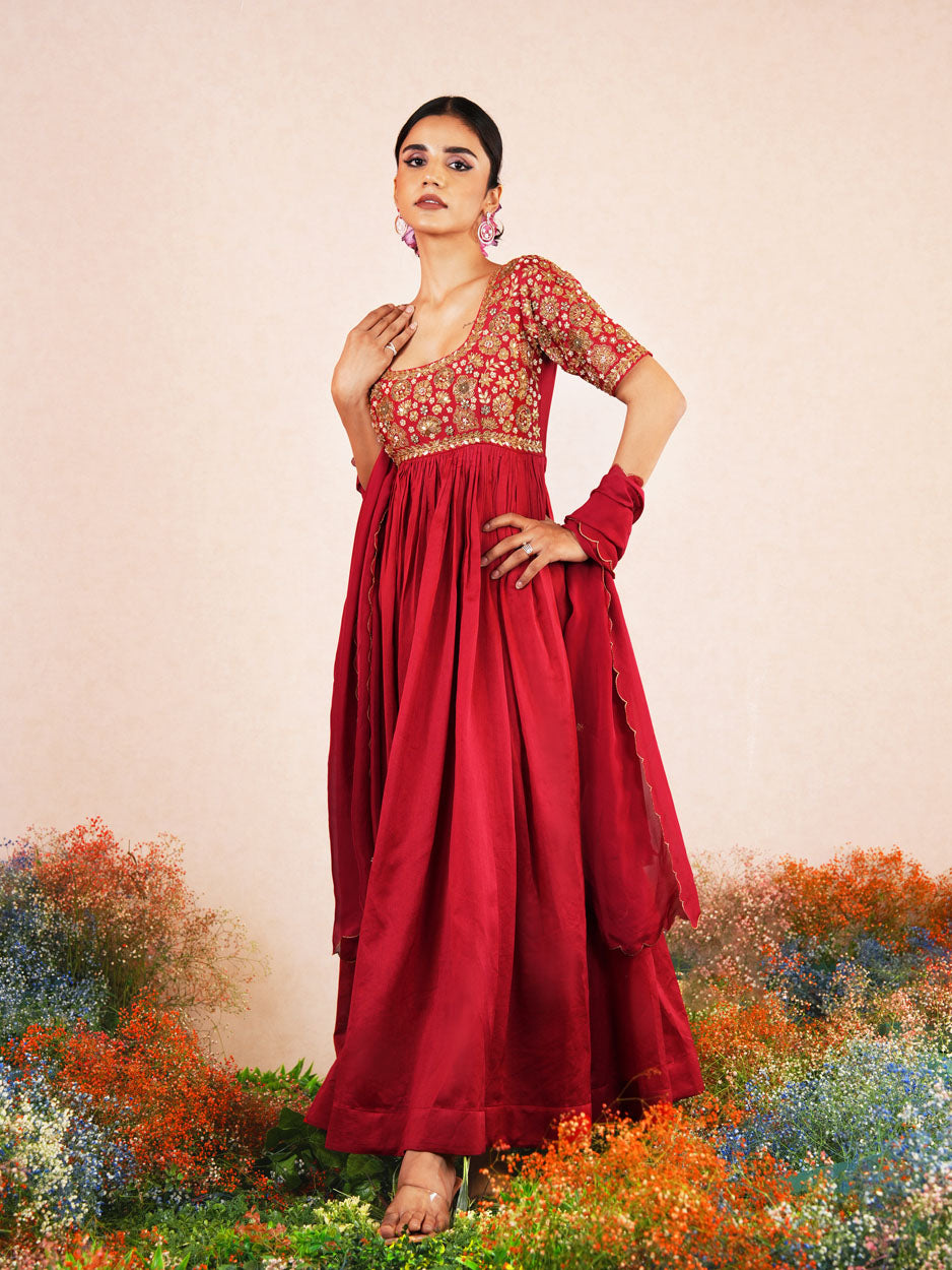 Featuring the Maroon Red chanderi silk intricate hand embroidered Anarkali paired with self soft silk dupatta.