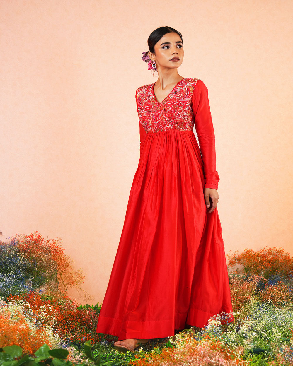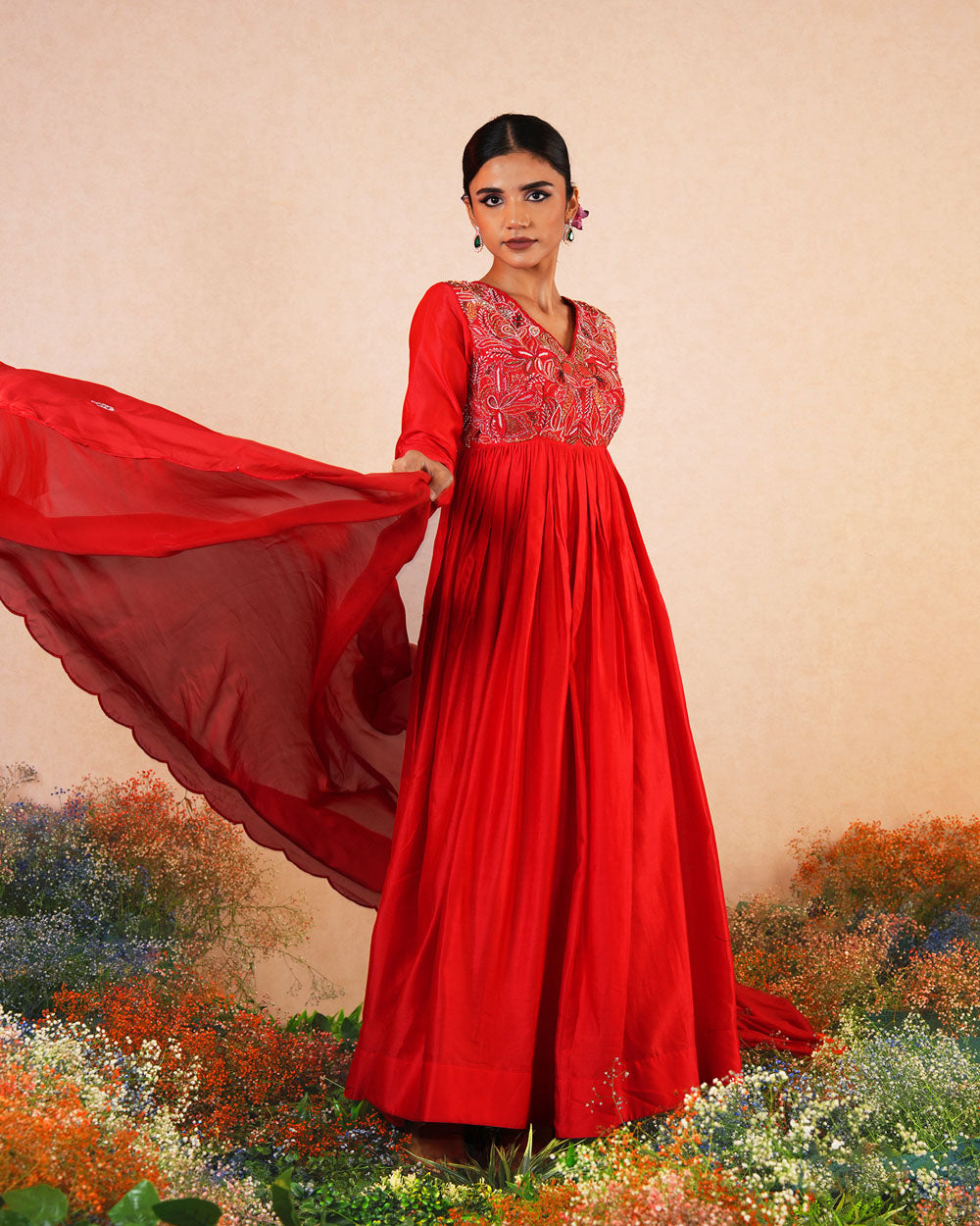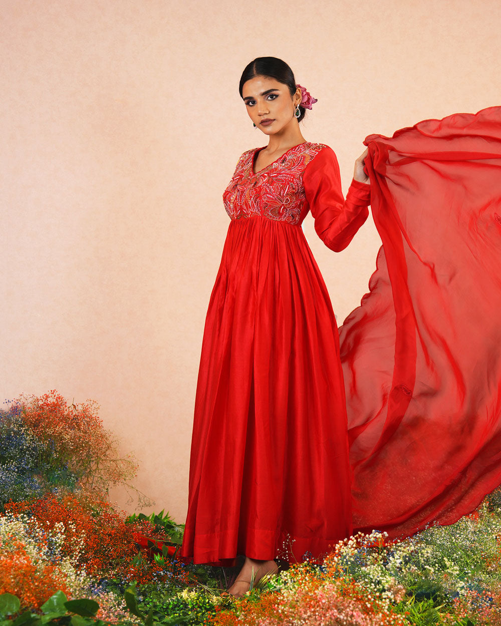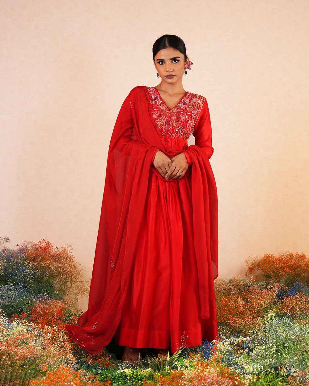 Featuring the red chanderi silk intricate hand embroidered Anarkali paired with self soft silk dupatta.