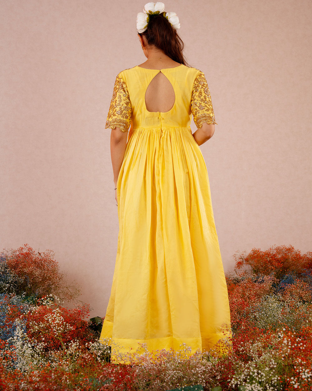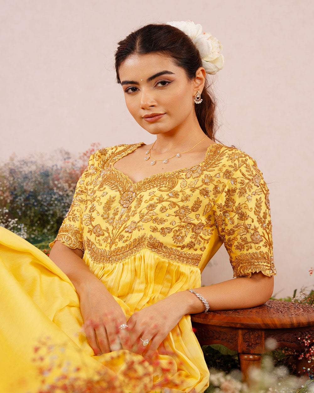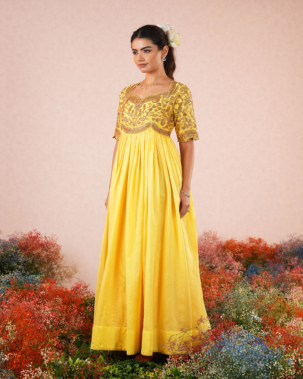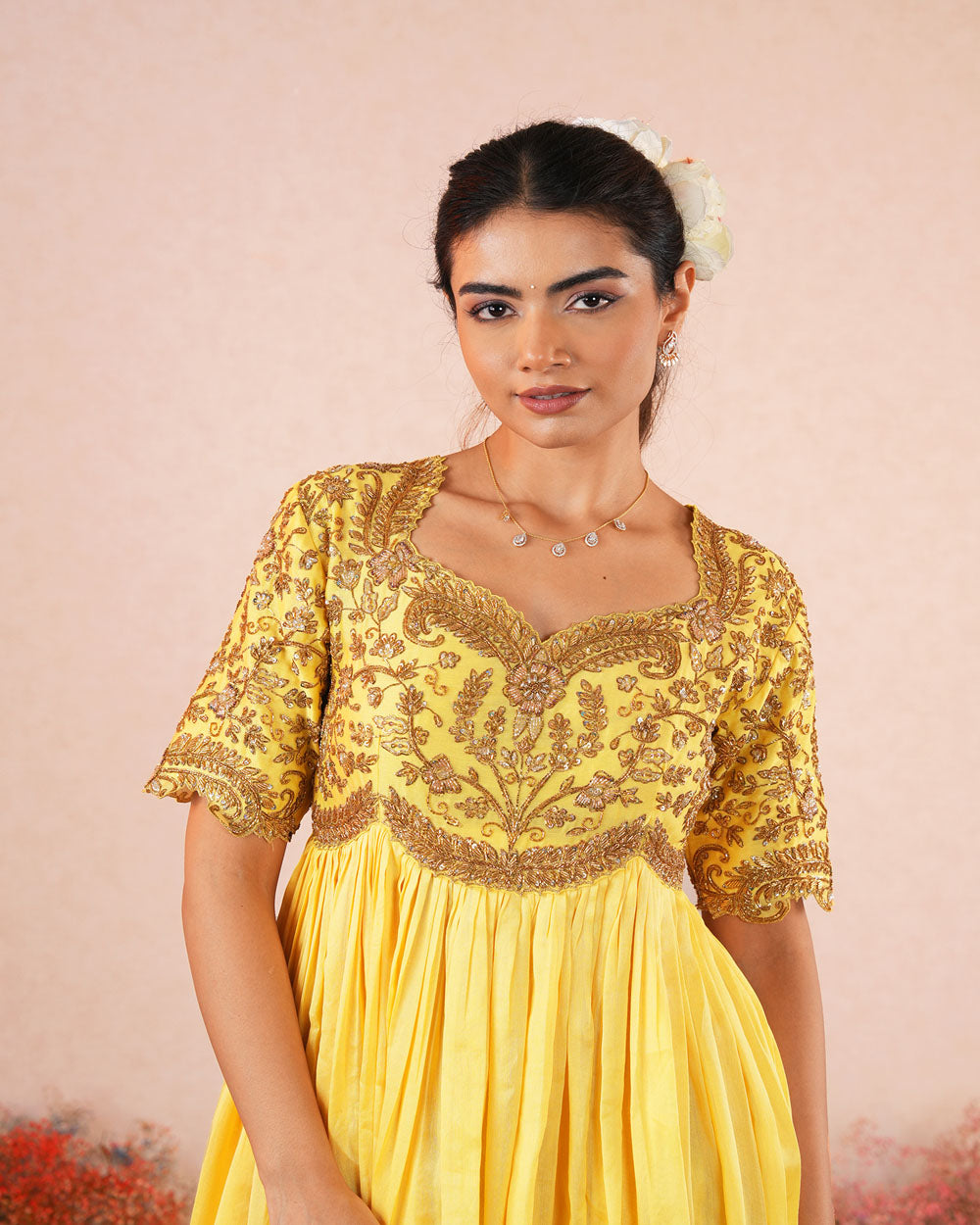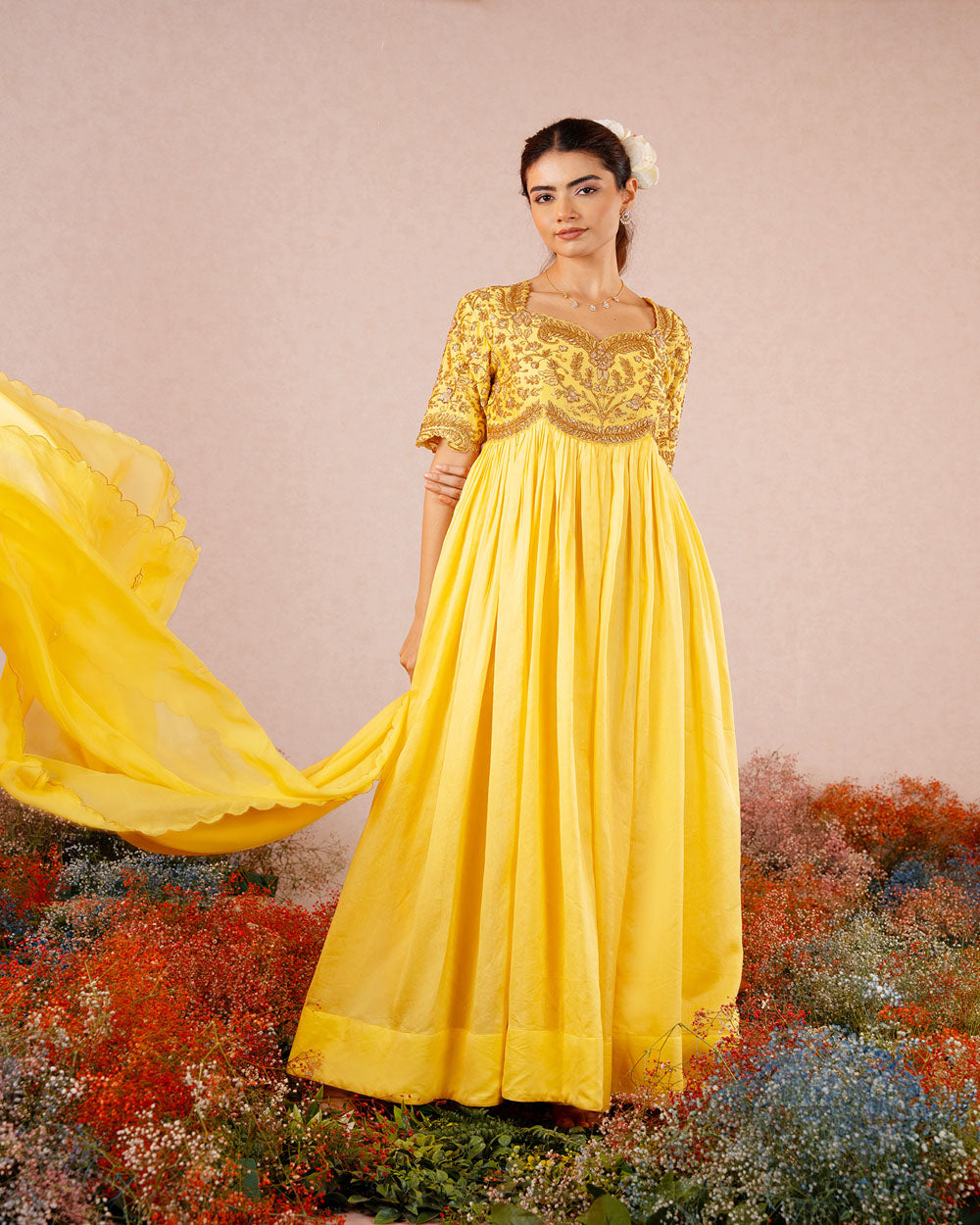 Featuring the yellow chanderi silk intricate hand embroidered Anarkali paired with self soft silk dupatta.