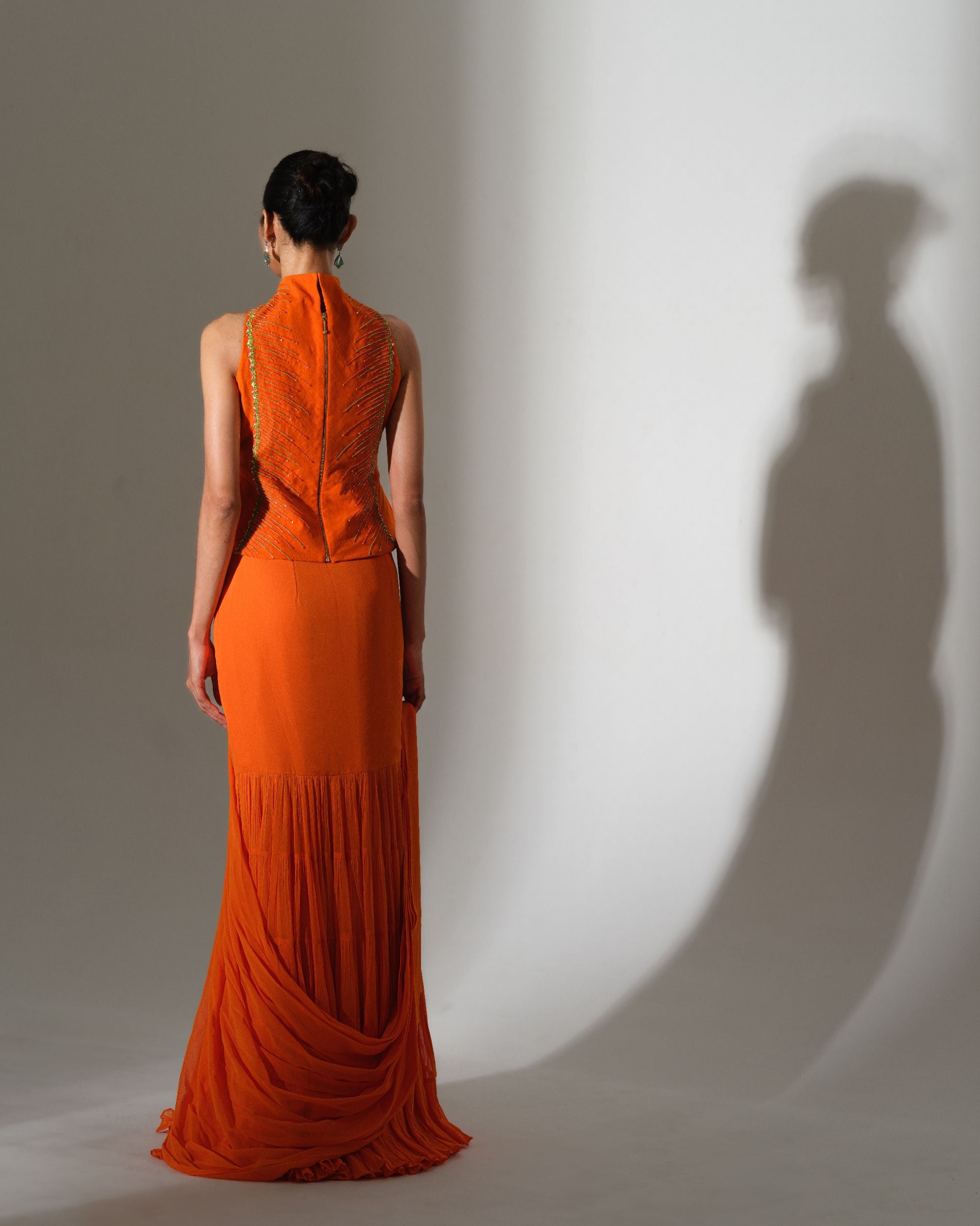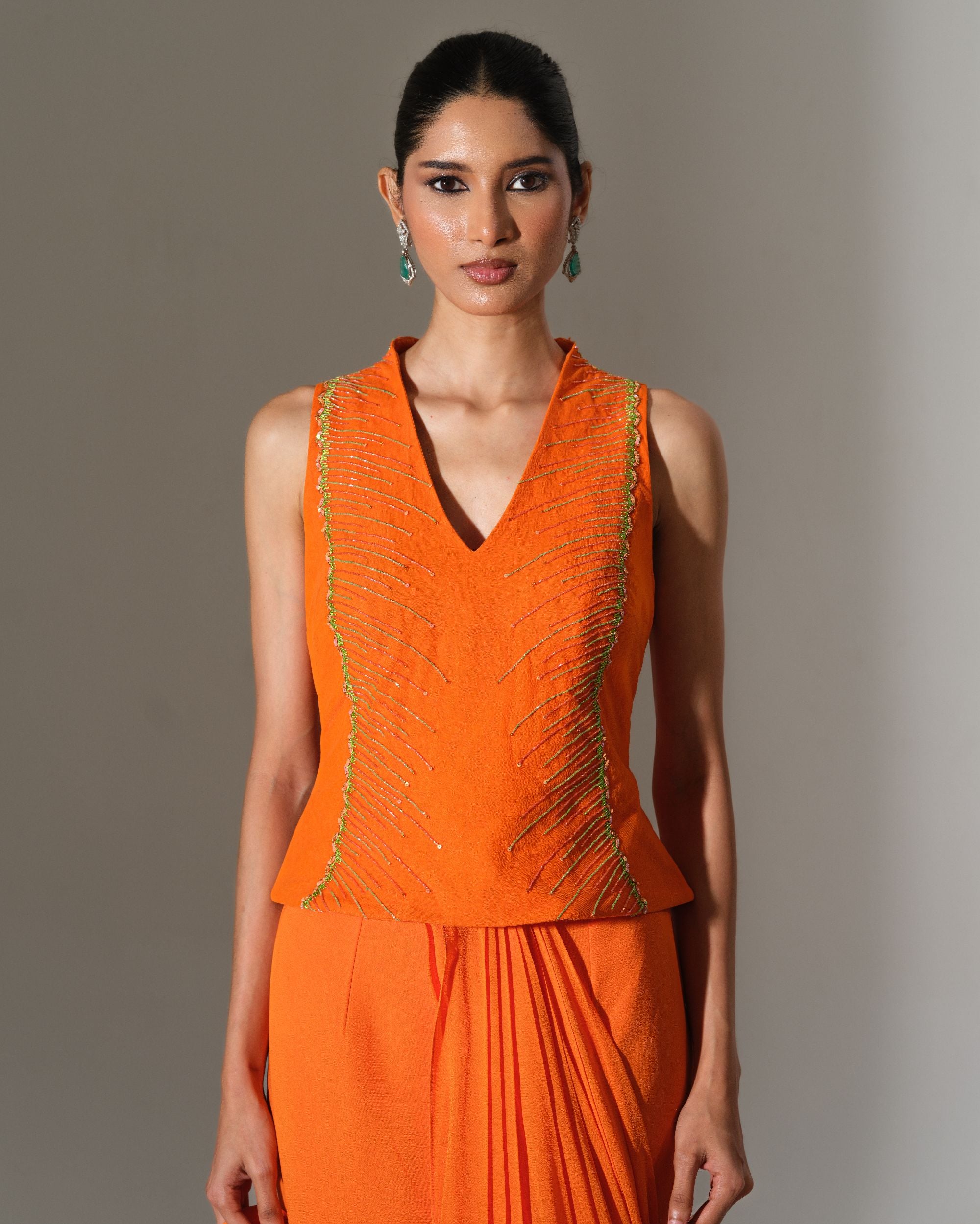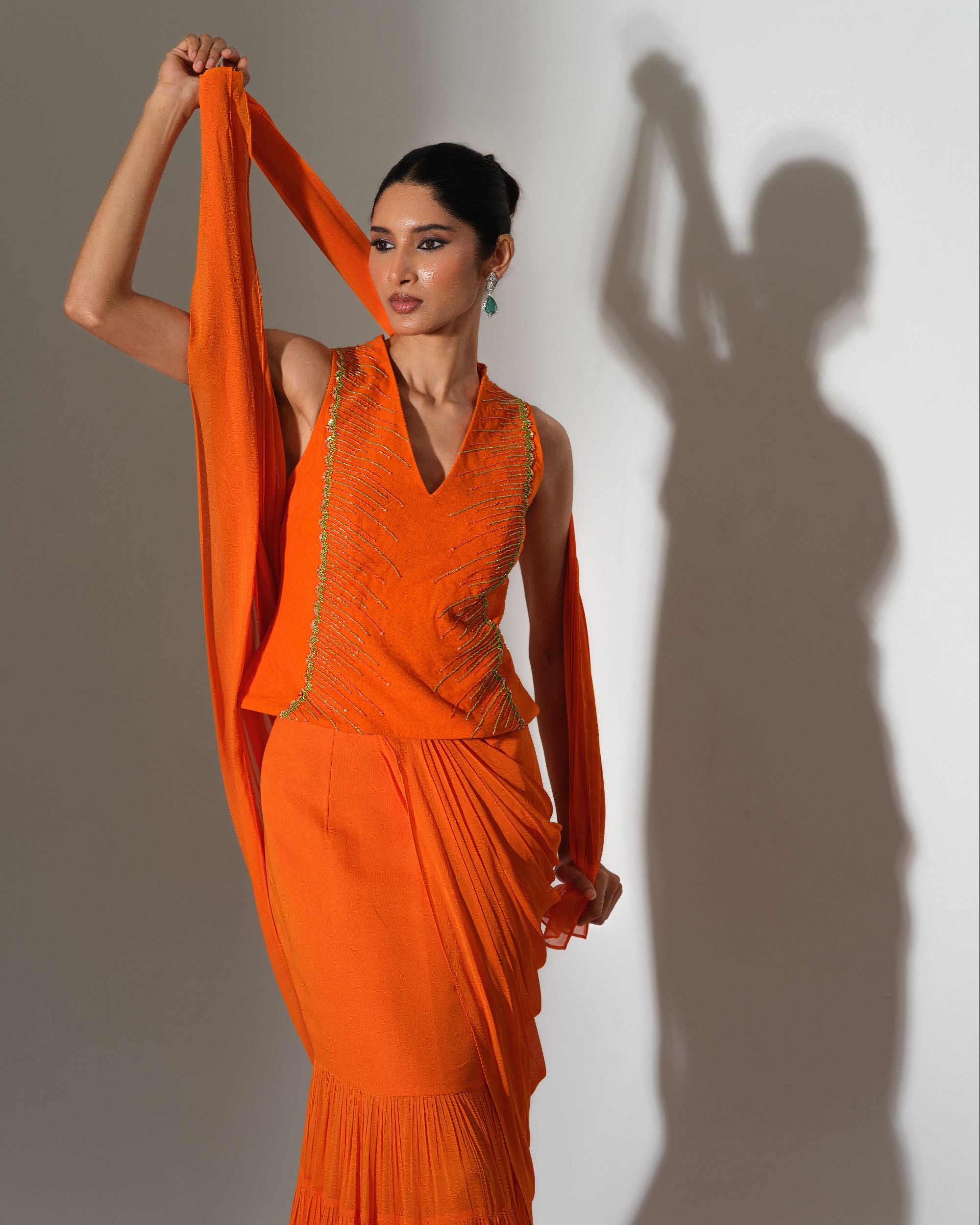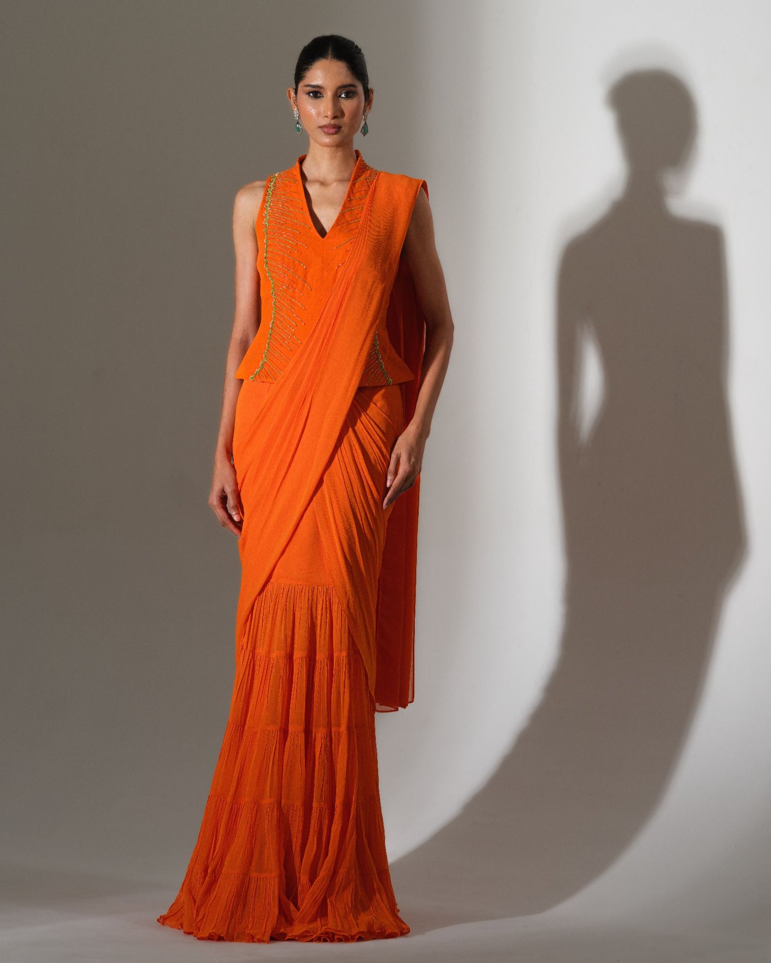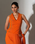 A vibrant ode to fire and fluidity, this striking orange drape commands attention with effortless grace. The sculpted blouse, accented with delicate embellishment, adds sharp definition to the silhouette. Soft pleats cascade into layered movement, creating rhythm and dimension with every step. Bold, radiant, and unapologetically confident, it embodies modern power dressing in saree form.