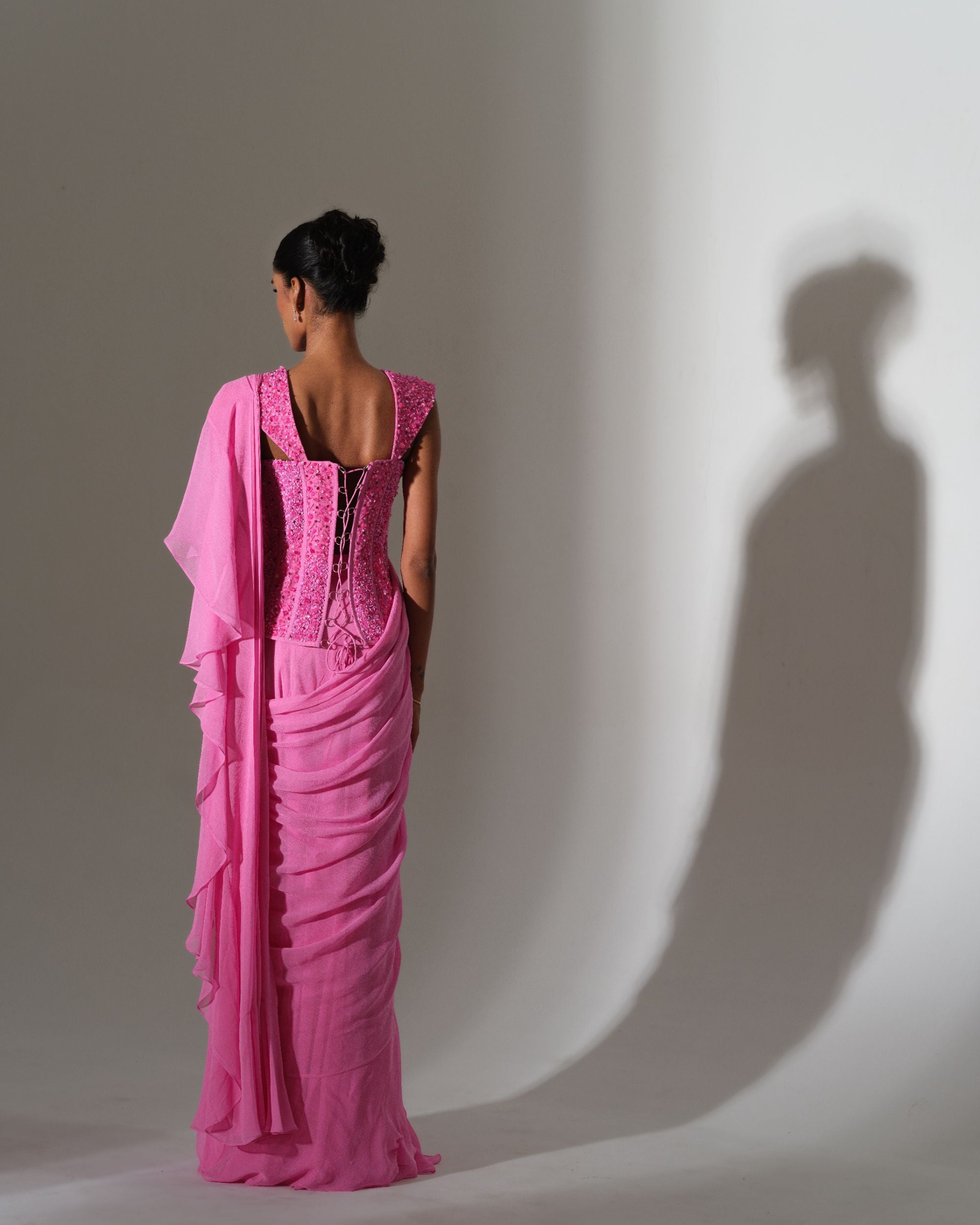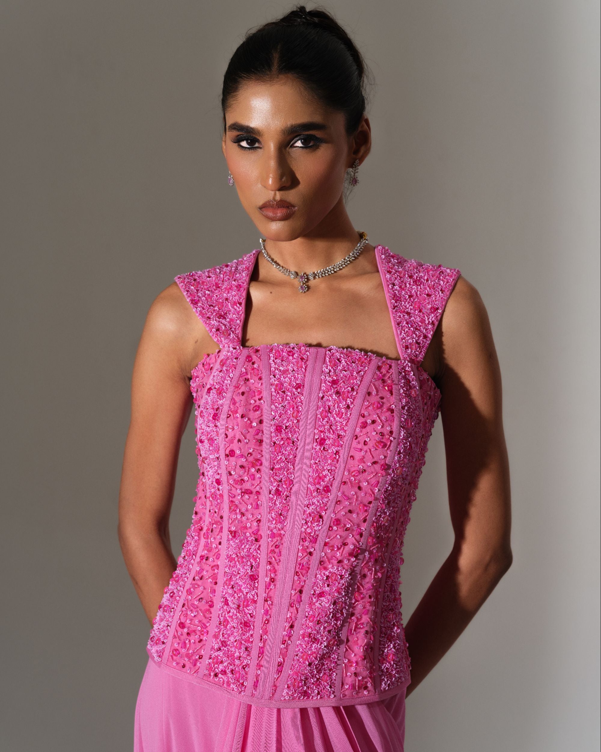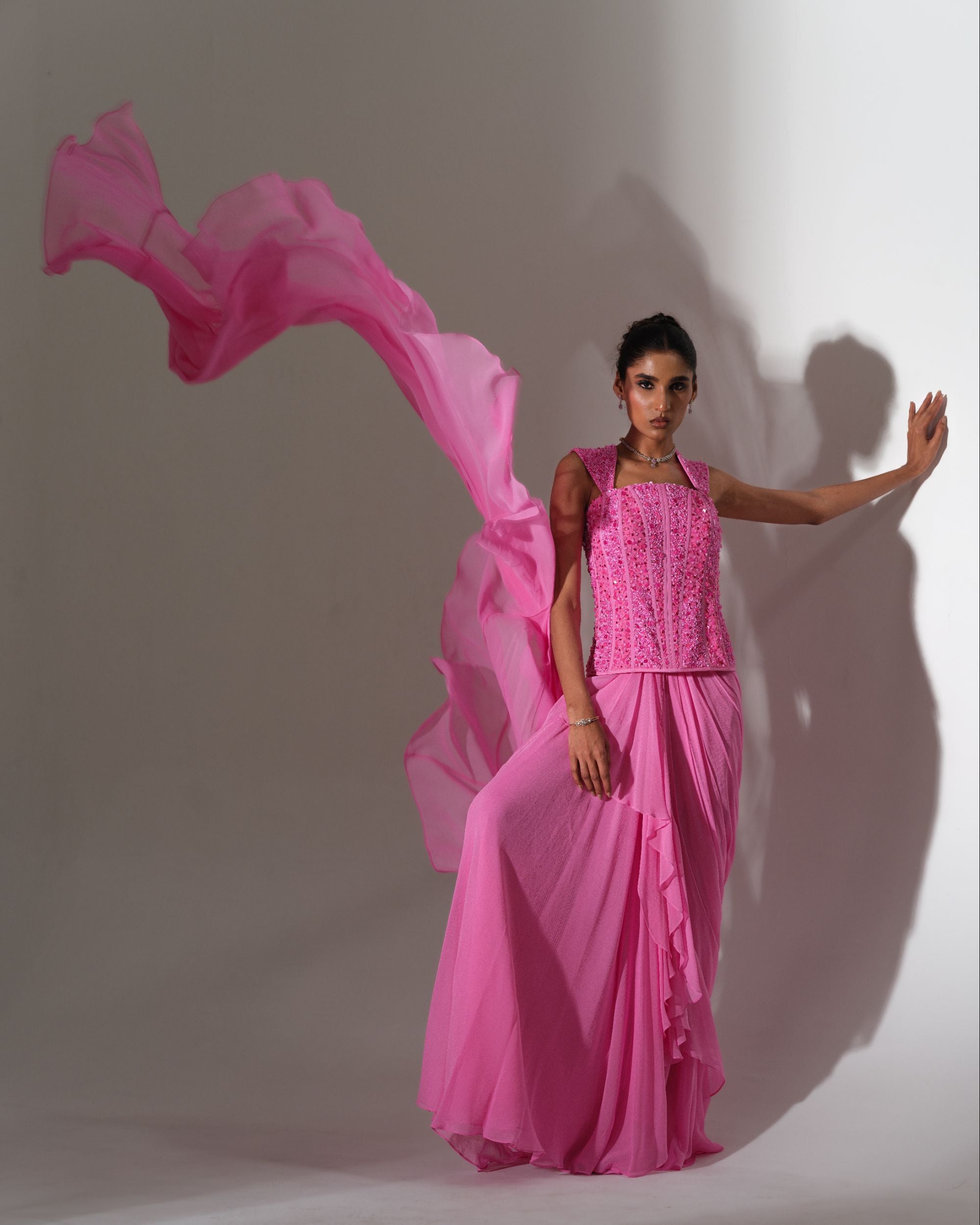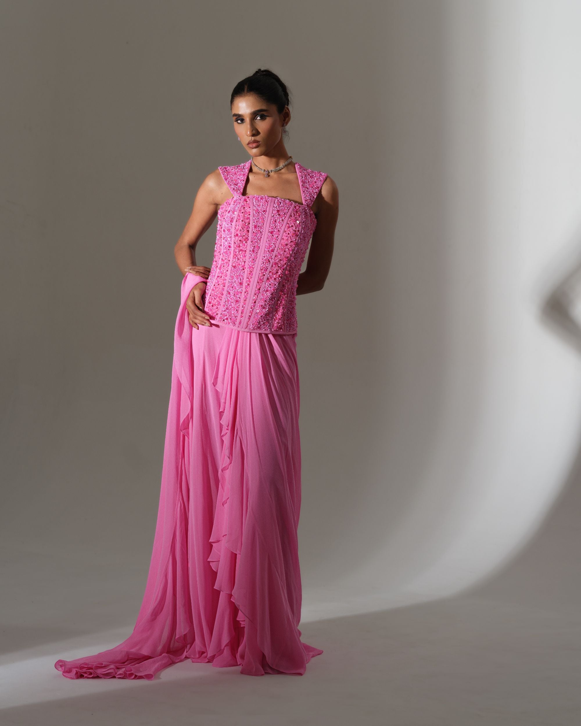 A dreamy expression of modern romance, this blush-pink ensemble pairs a delicately embellished corset with a fluid, cascading drape. The sculpted bodice adds structure and sparkle, while soft ruffles create graceful movement. Airy and luminous, the flowing fabric brings drama with effortless lightness. Feminine, bold, and captivating in every detail.