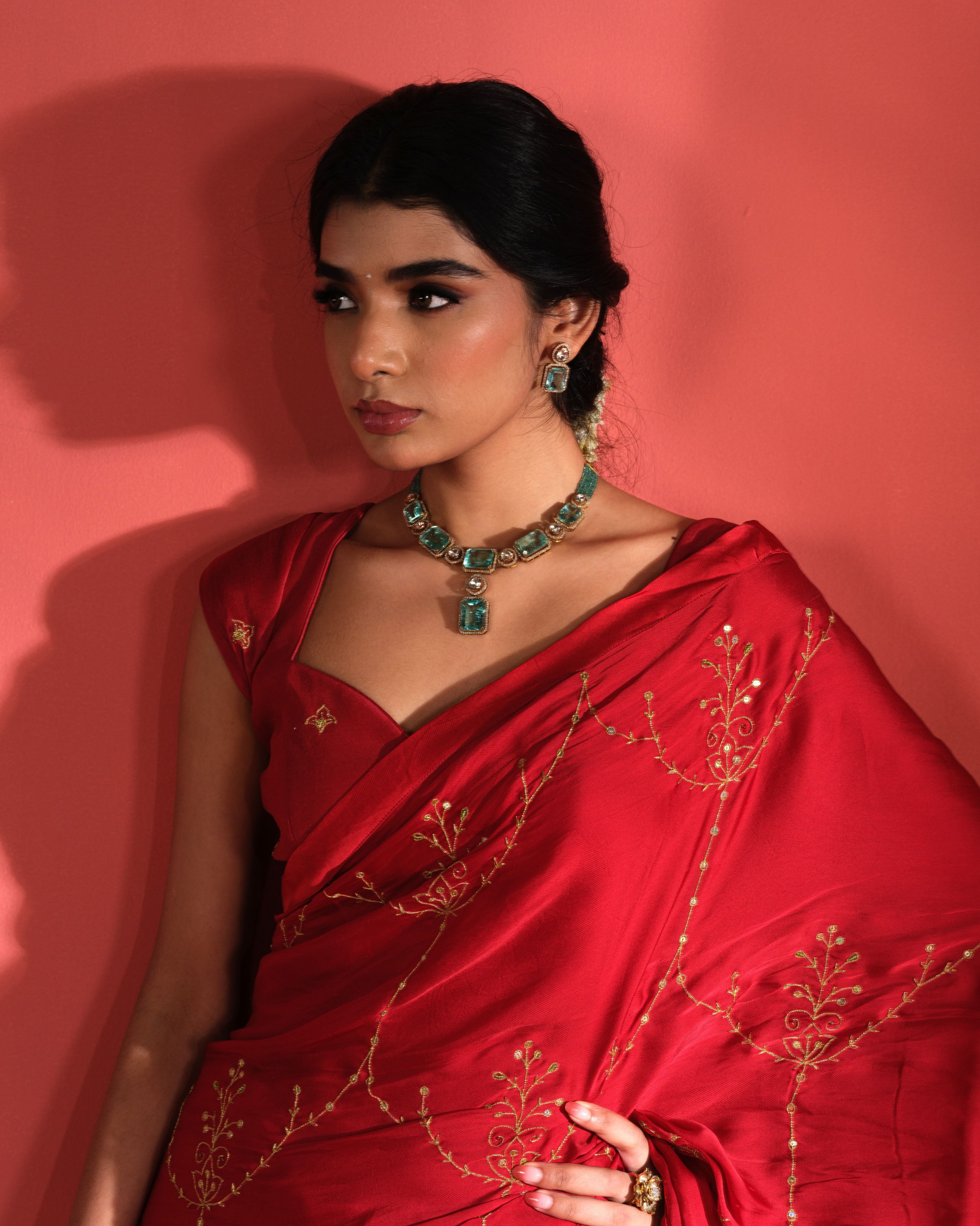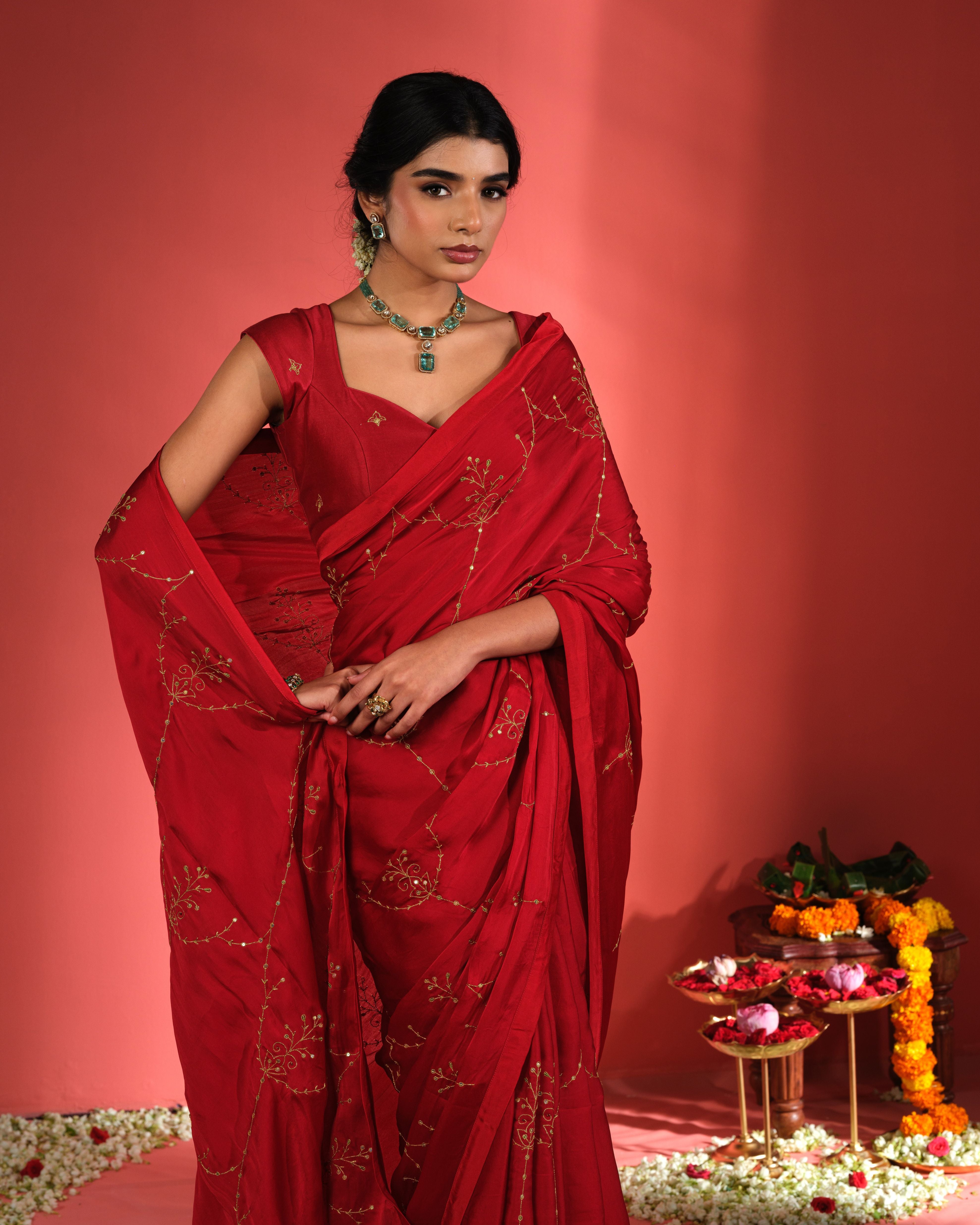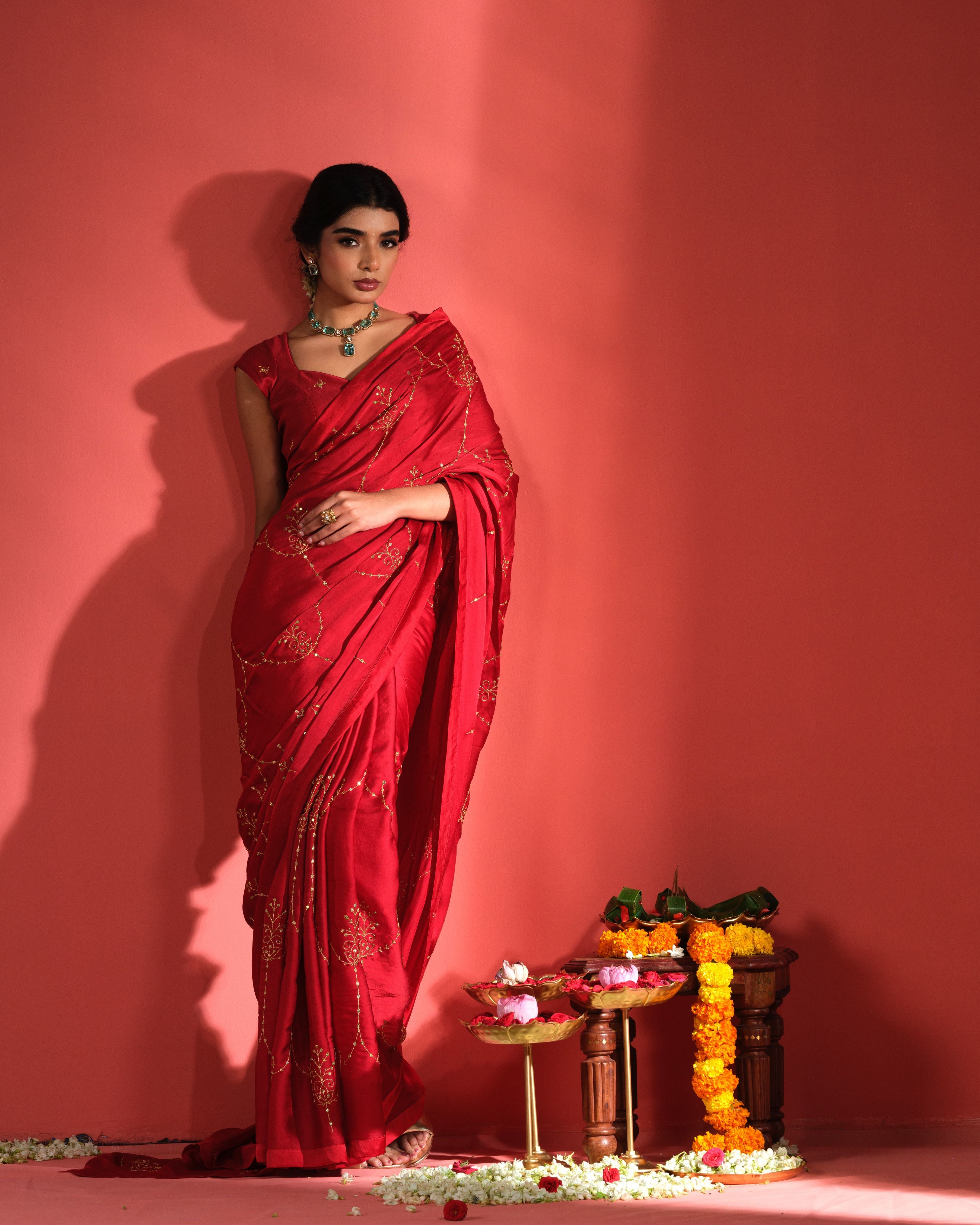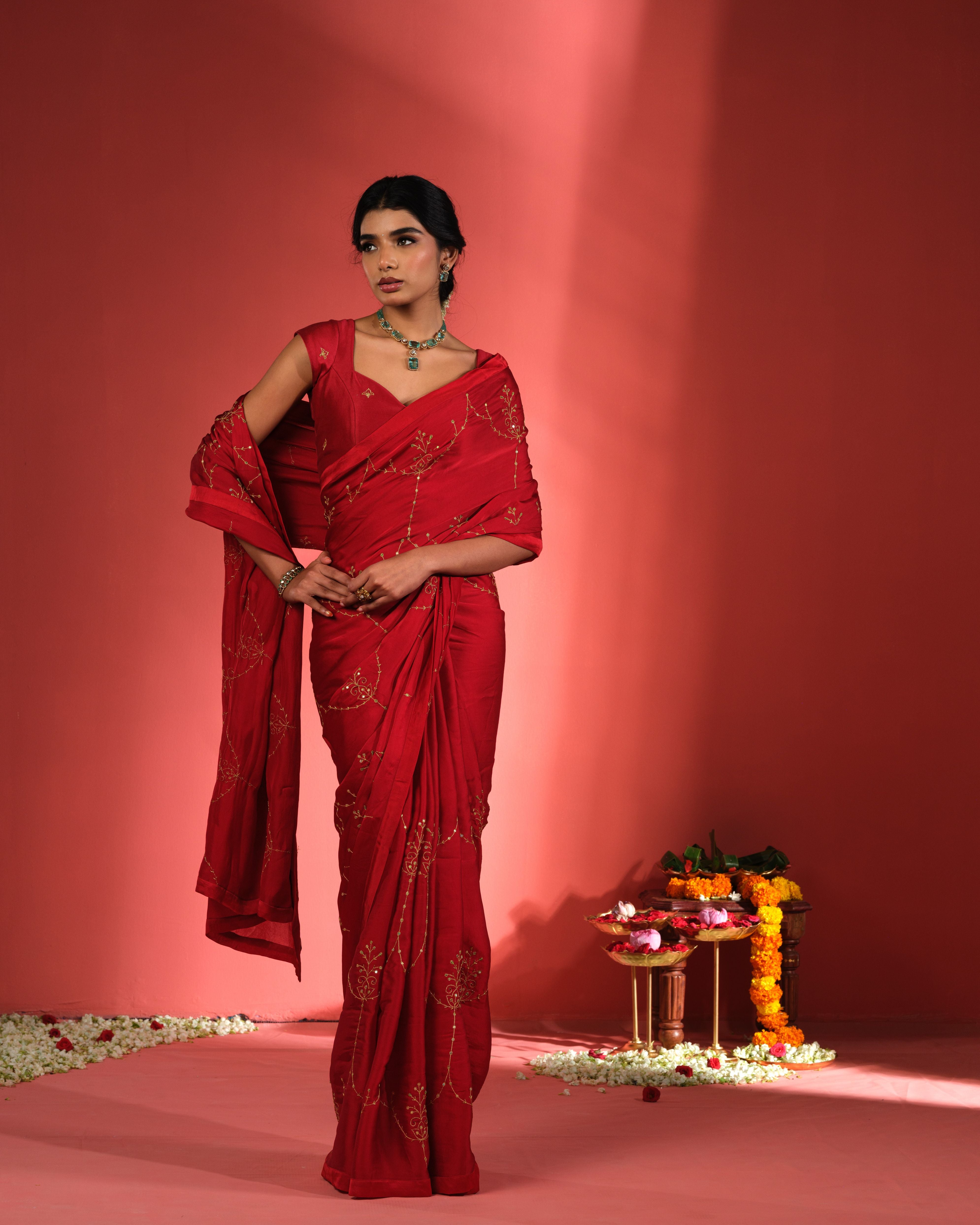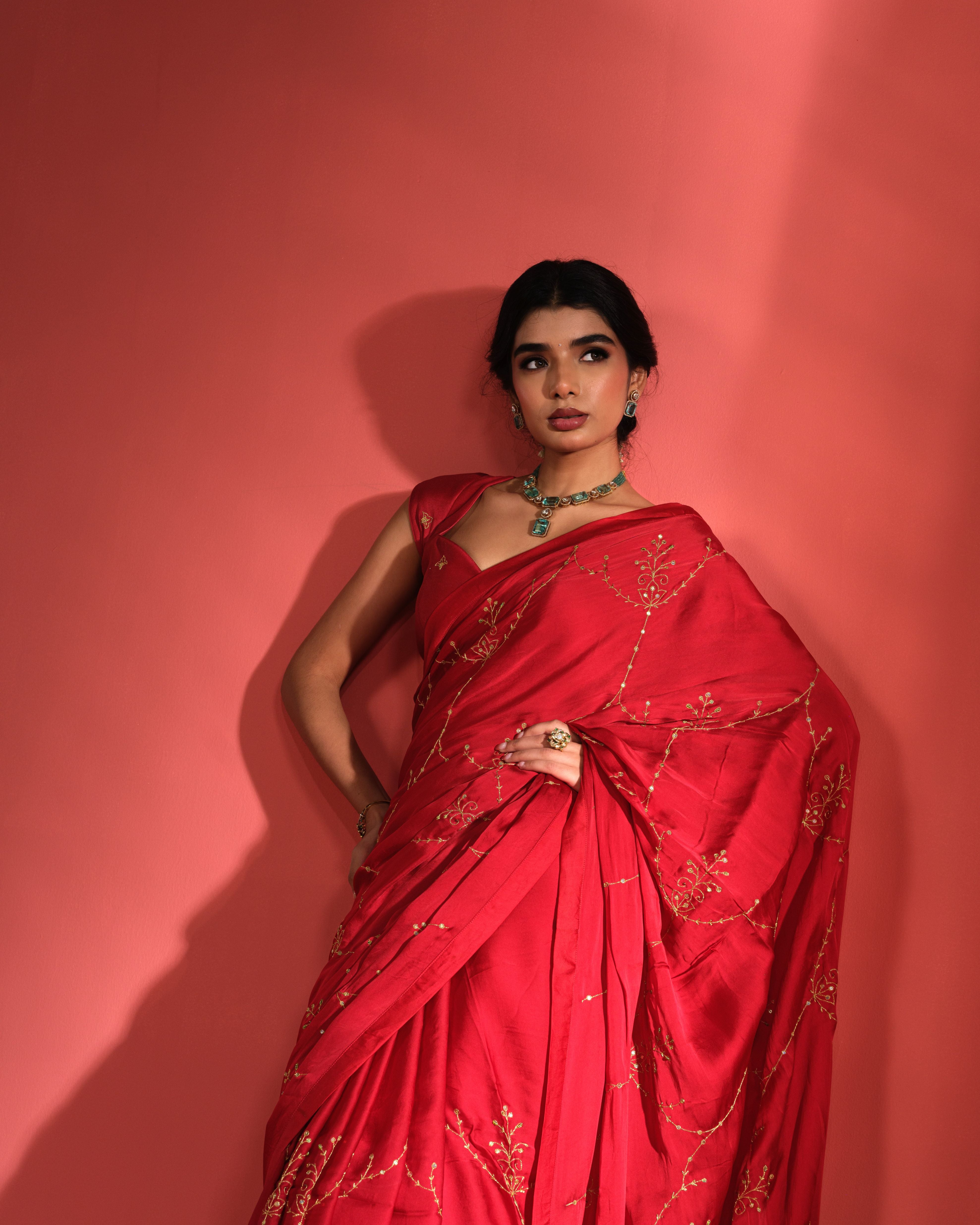 Draped in deep carnelian red, this hand embroidered saree captures the timeless allure classic Indian attire adorned with delicate metallic zari work.