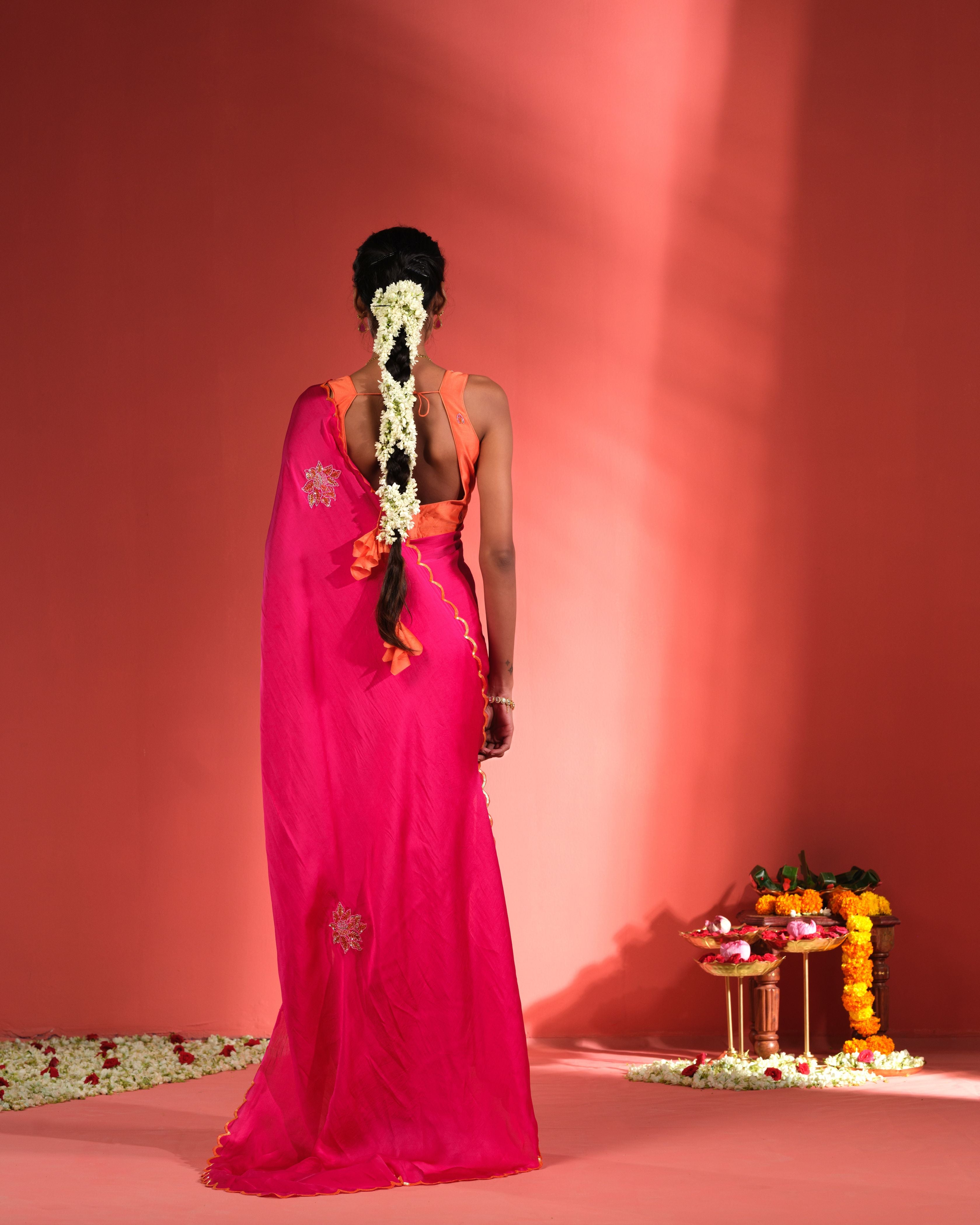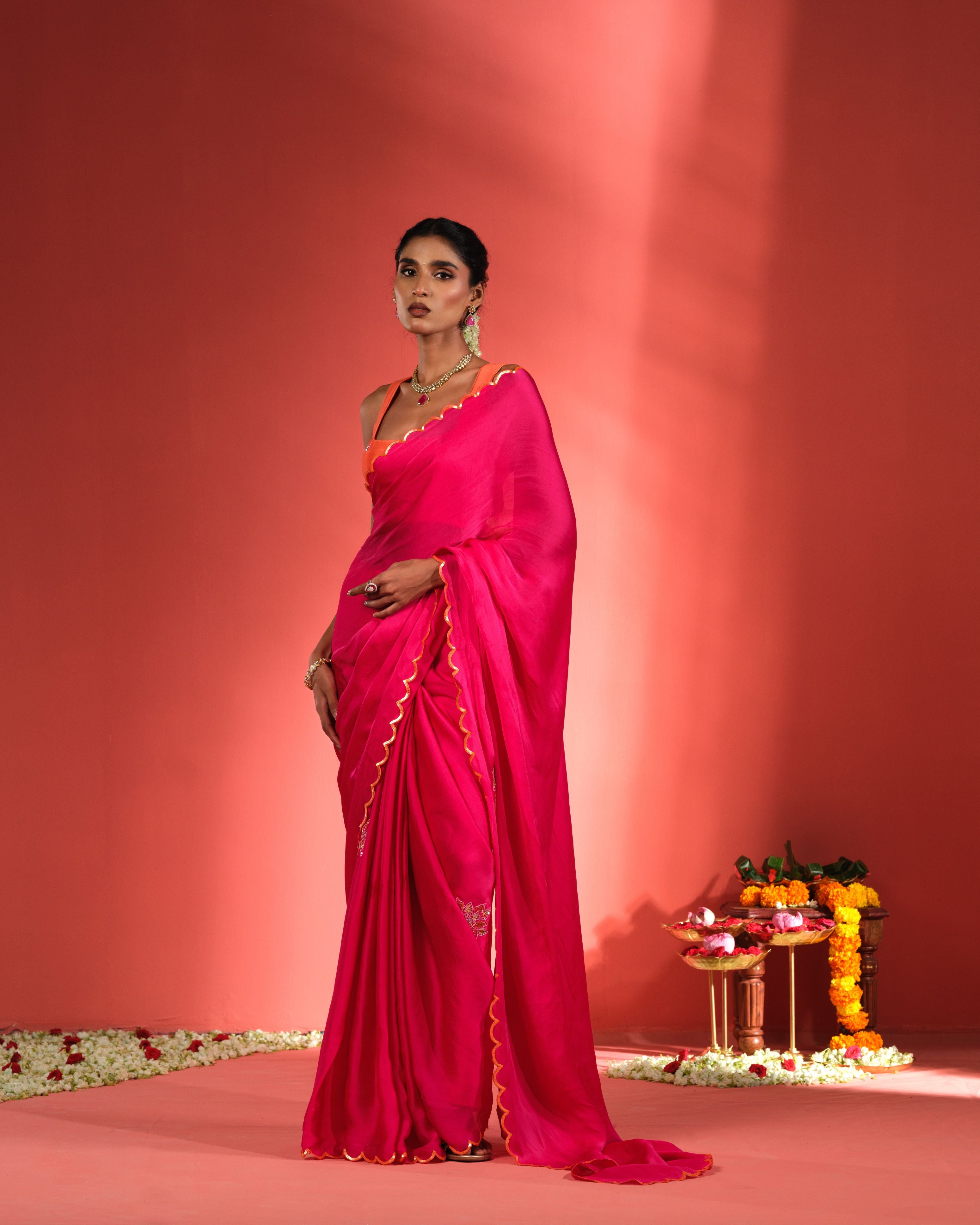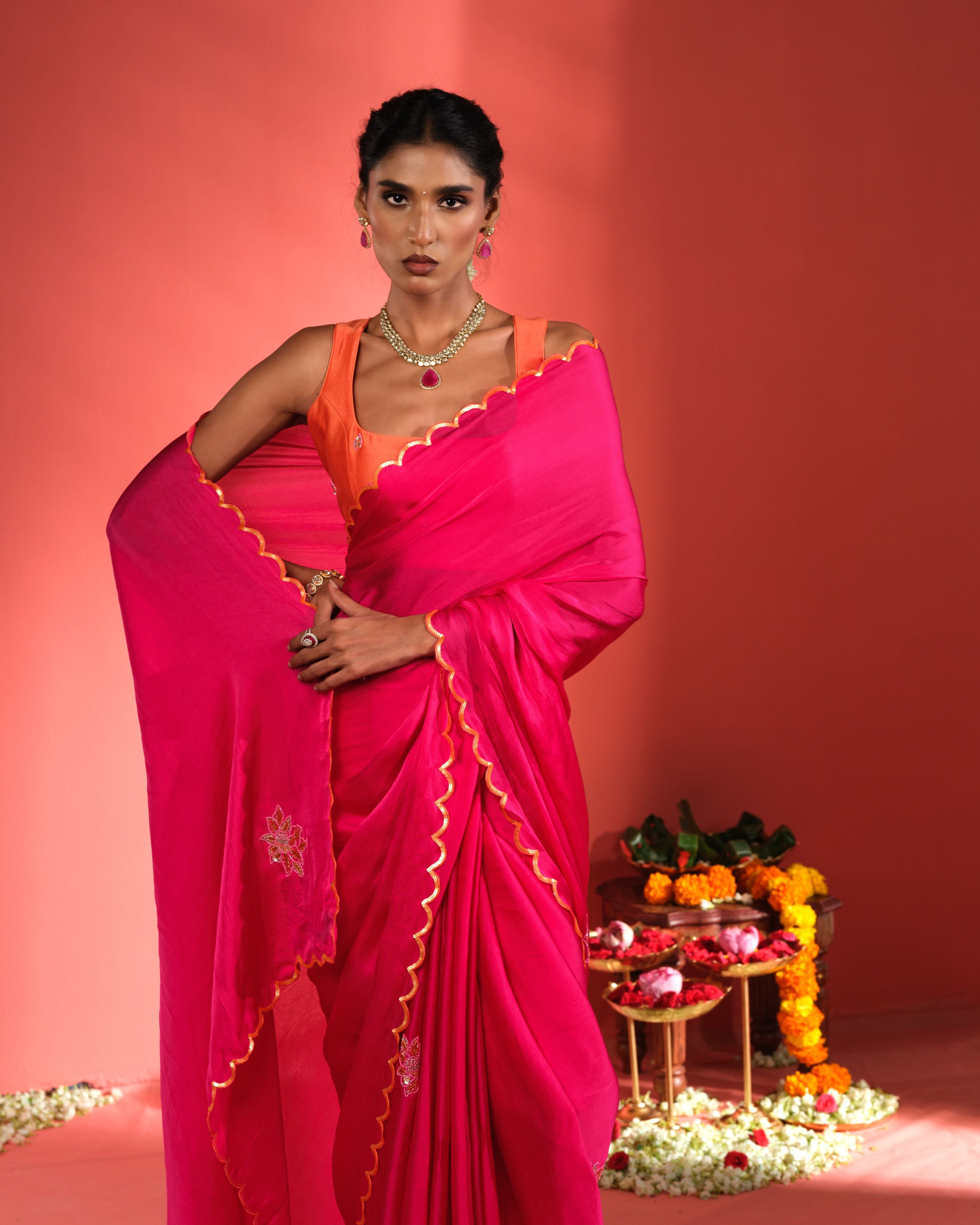 Draped in rani pink, this hand-embroidered, scalloped saree with all over floral motifs captures the timeless allure of class.
