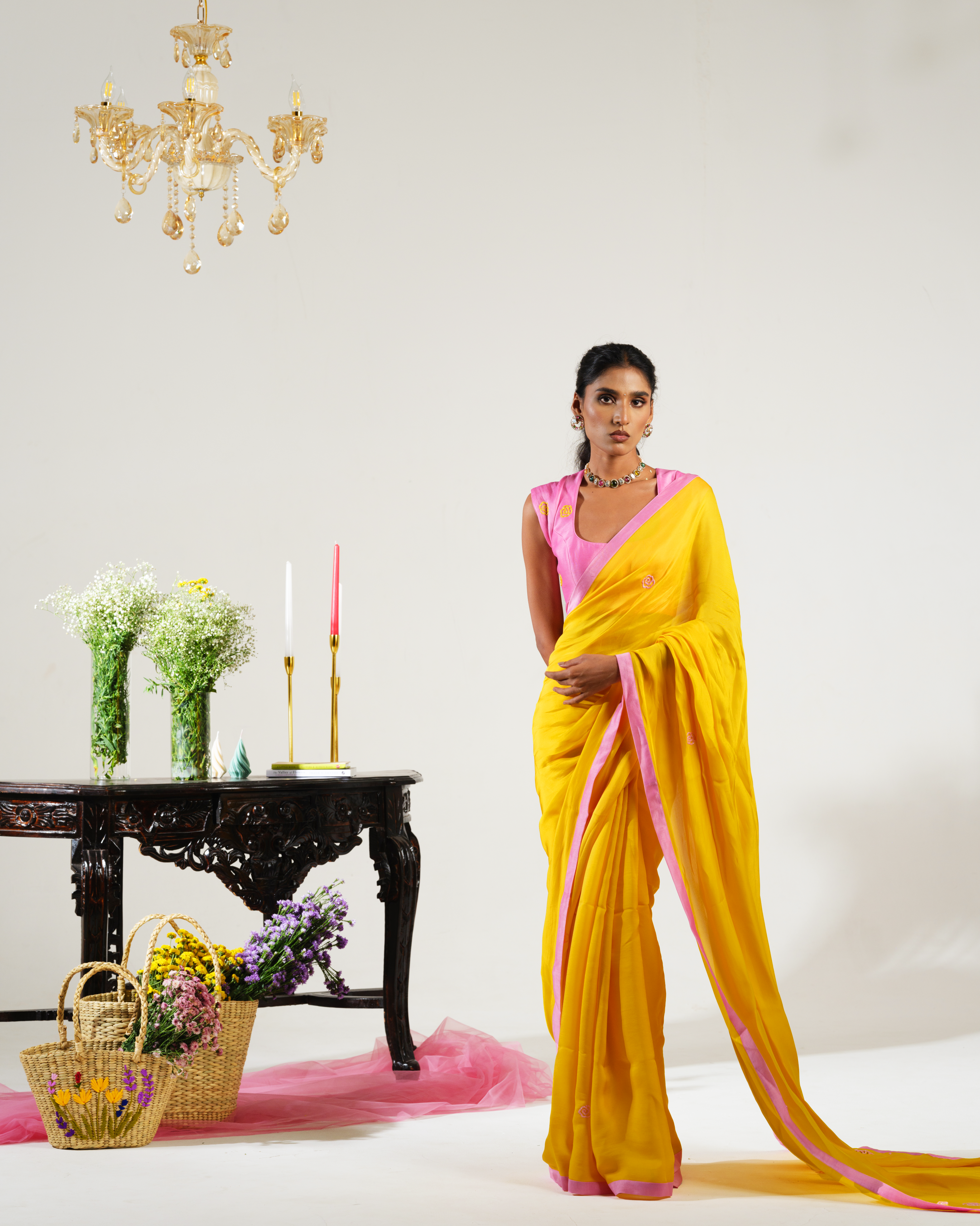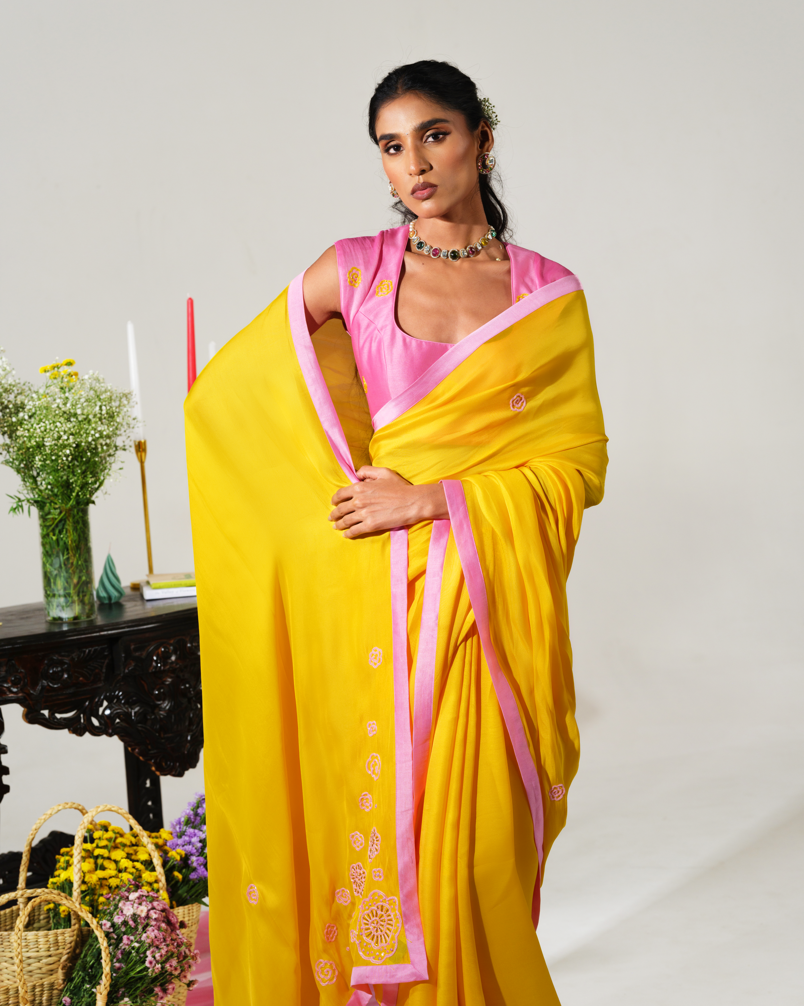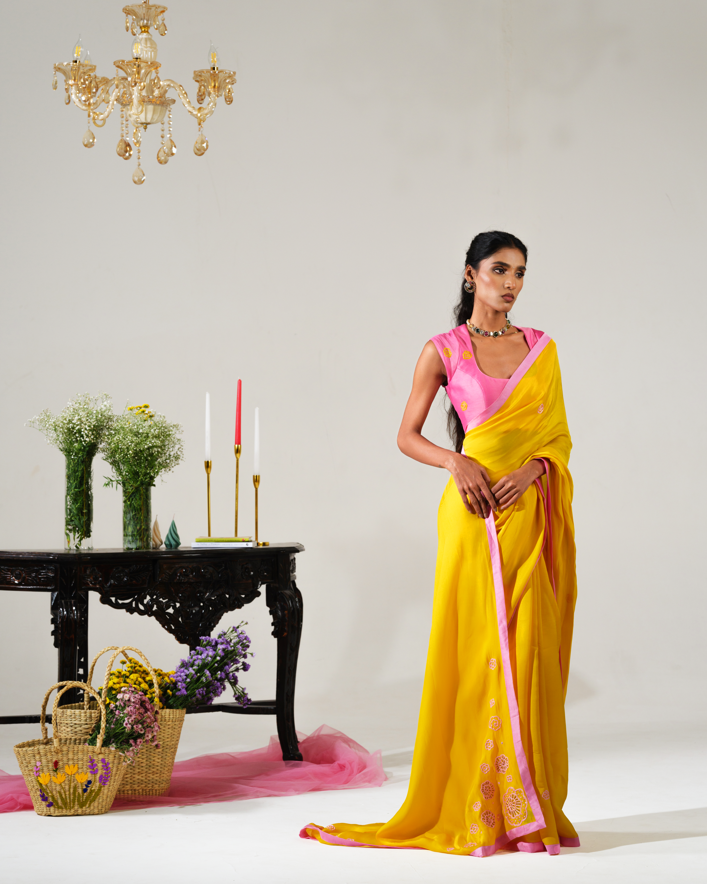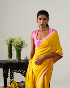 Bring sunshine to any celebration with this cheerful yellow saree adorned with delicate pink cutdana and intricate thread floral motifs.