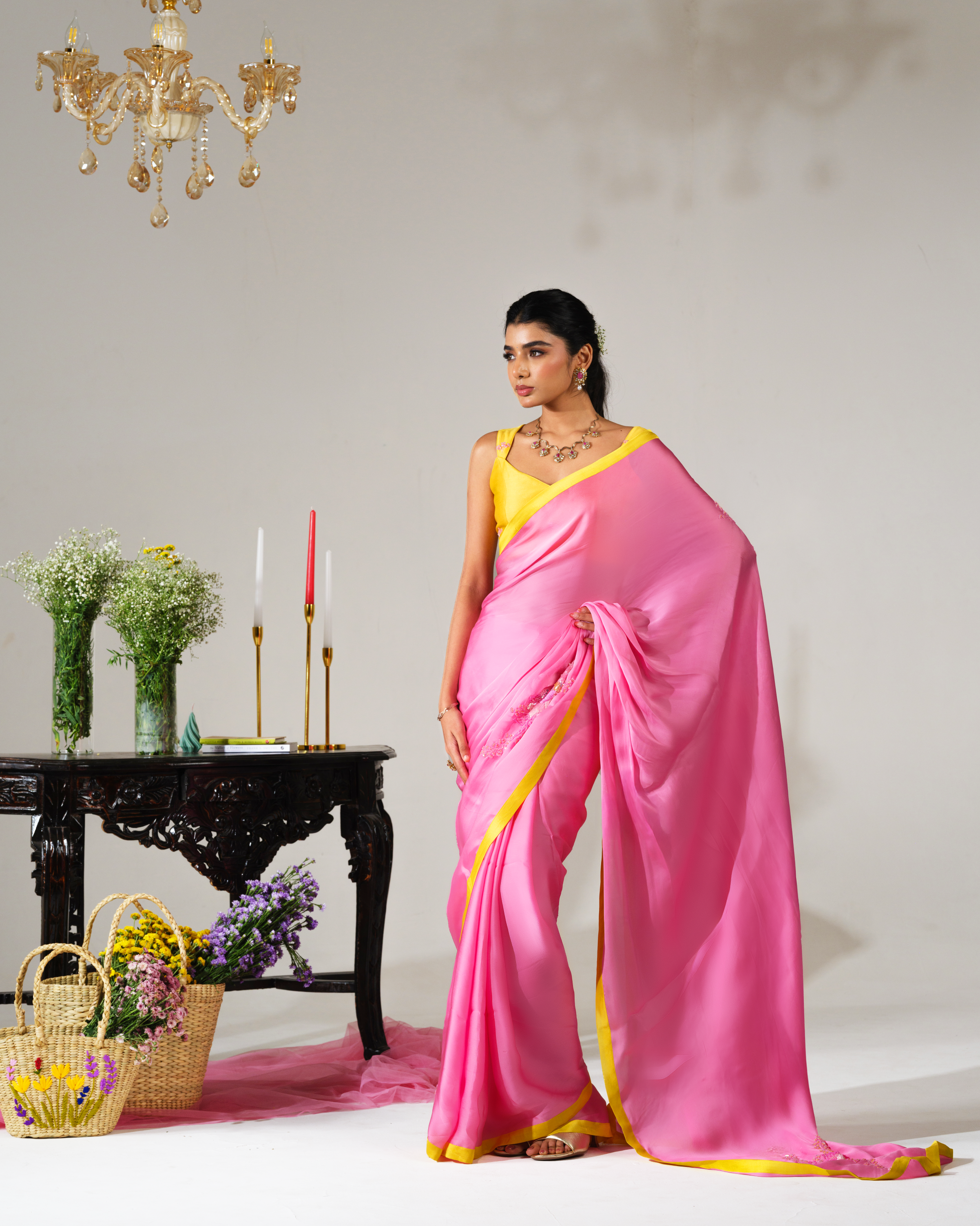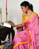 Exude deliacte charm and festive elegance with this light pink saree, adorned with sparkling sequins and intricate cutdana embroidery.