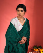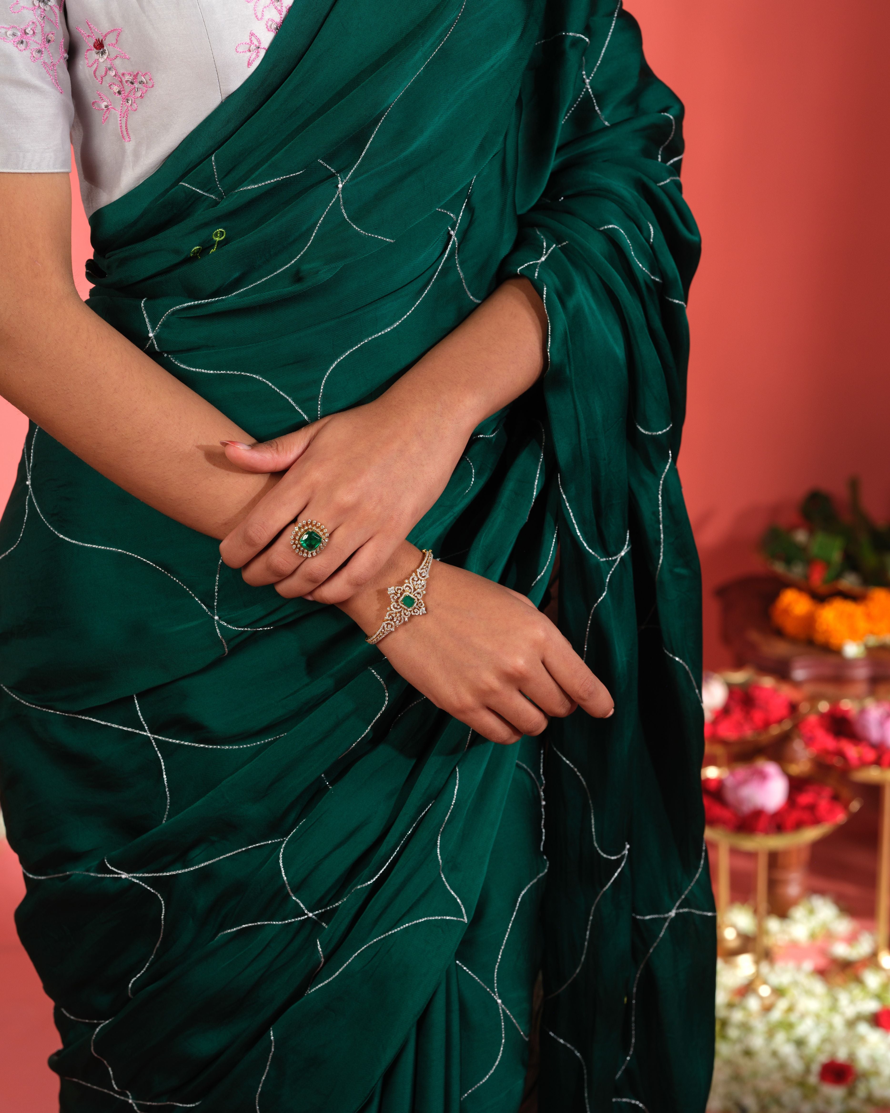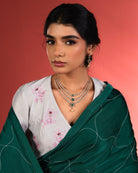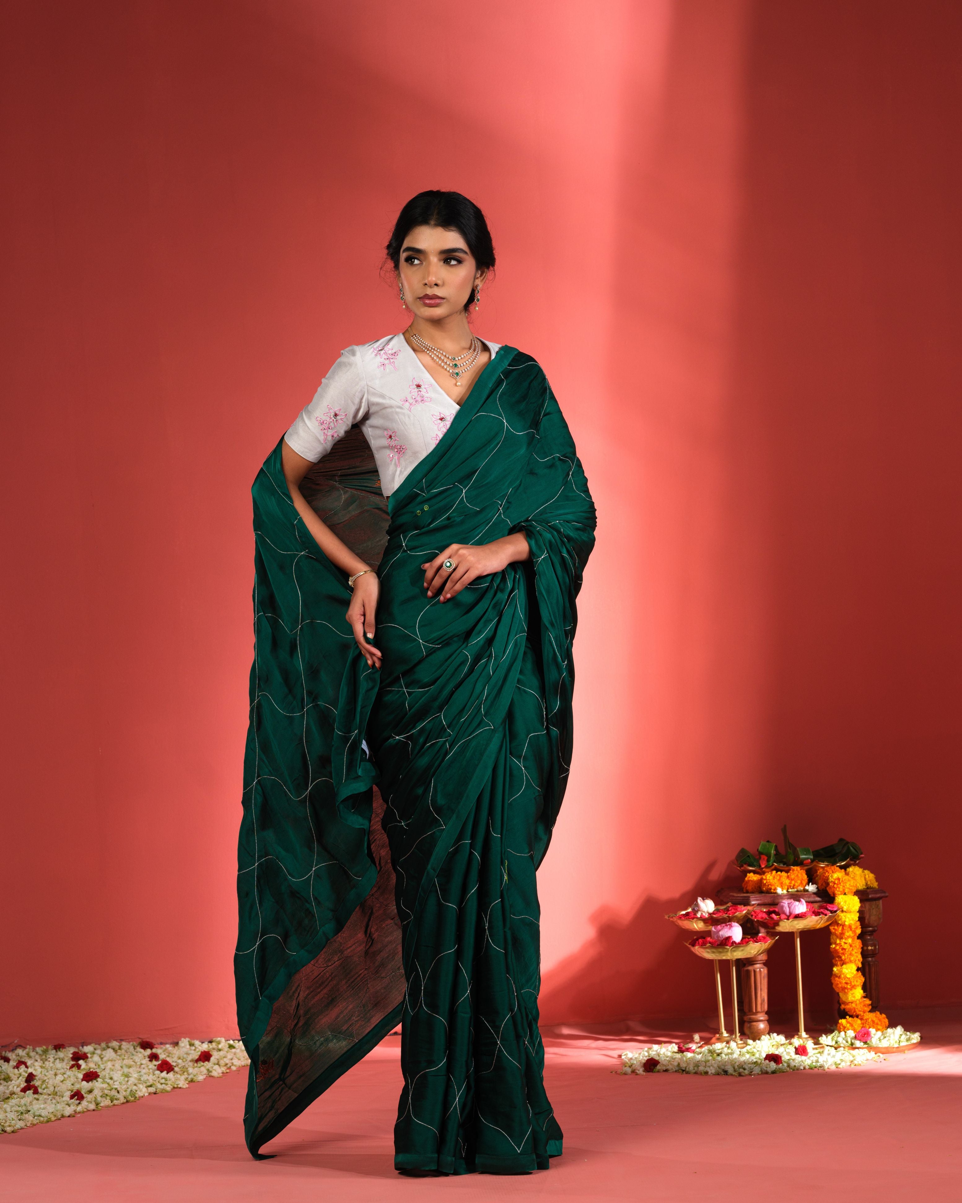 Elevate your elegance with this stunning green saree adorned with intricate silver zari embroidery radiates sophistication and charm.